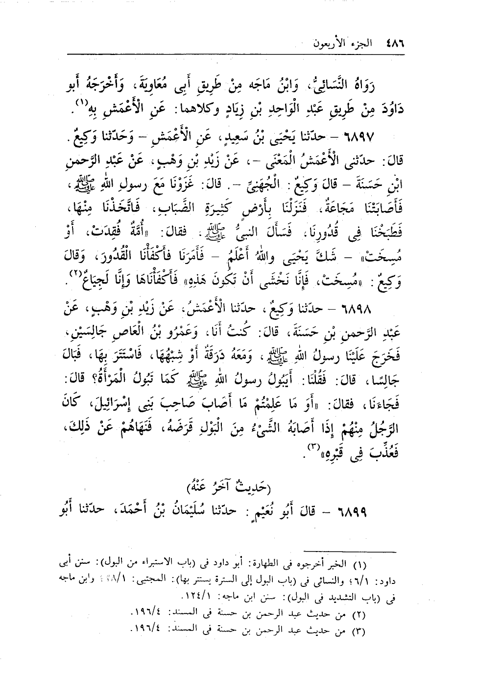 (¬1) الخبر أخرجوه فى الطهارة: أبو داود فى (باب الاستبراء من البول) : سنن أبى داود: 1/6؛ والنسائى فى (باب البول إلى السترة يستتر بها) : المجتبى: 1/28: وابن ماجه فى (باب التشديد فى البول) : سنن ابن ماجه: 1/124.