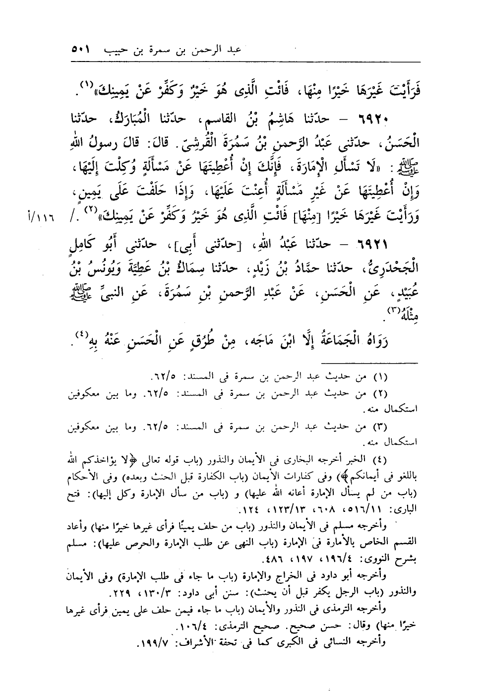 (¬3) الخبر أخرجه البخارى فى الأيمان والنذور (باب قوله تعالى {ولا يؤاخذكم الله باللغو فى أيمانكم} وفى كفارات الأيمان) باب الكفارة قبل الحنث وبعده) وفى الأحكام (باب من لم يسأل الإمارة أعانه الله عليها) و (باب من سأل الإمارة وكل إليها) : فتح البارى: 11/516، 608، 13/123، 124.