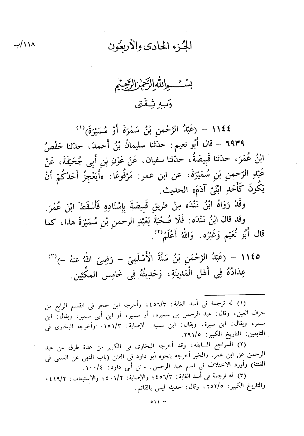 (¬1) له ترجمة فى أسد الغابة: 3/456؛ وأخرجه ابن حجر فى القسم الرابع من حرف العين، وقال: عبد الرحمن بن سميرة، أو سمير، أو ابن أبى سمير، ويقال: ابن سمر، ويقال: ابن سيرة، ويقال: ابن سمية. الإصابة: 3/151؛ وأخرجه البخارى فى التابعين: التاريخ الكبير: 5/291.