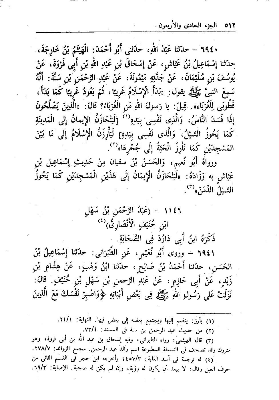 6940 - حدثنا عبد الله، حدثنى أبو أحمد: الهيثم بن خارجة، حدثنا إسماعيل ابن عياشٍ، عن إسحاق بن عبد الله بن أبى فروة، عن يوسف بن سليمان، عن جدته ميمونة، عن عبد الرحمن بن سنة: أنه سمع النبى - صلى الله عليه وسلم - يقول: «بَدَأَ الإِسْلاَمُ غَرِيبًا، ثُمّ يَعُودُ غَرِيبًا كَمَا بَدَأَ، فَطُوبَى لِلْغُرَبَاء» . قيل: يا رسول الله من الغرباء؟ قال: «الَّذِينَ يَصْلُحُونَ إذَا فَسَدَ النَّاسُ، وَالَّذِى نَفْسِى بِيَدِه (¬1) ِ [ليأزرن الإِيمانُ إِلى الْمَدِينَةِ كَمَا يَحُوزُ السَّيْلُ، وَالَّذِى نَفْسِى بِيَدِهِ] ليأزرن الإِسْلاَمُ إِلى مَا بَيْنَ المَسْجِدَيْنِ كَمَا تأزر الْحَيَّةُ إِلَى جُحْرِهَا» (¬2) .