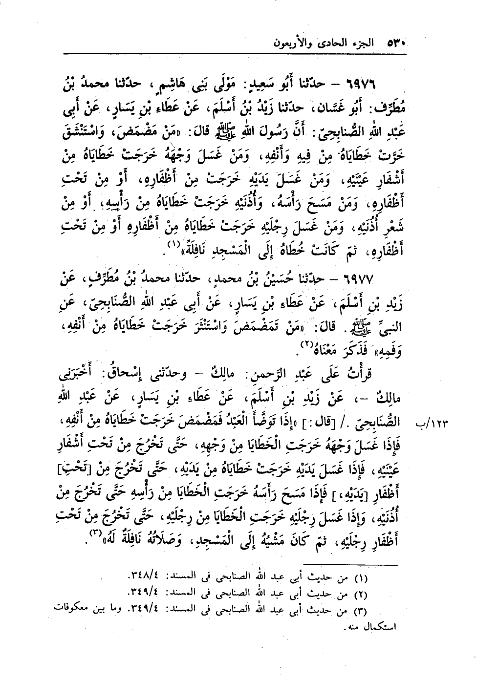 6976 - حدثنا أبو سعيدٍ: مولى بنى هاشم، حدثنا محمد بن مطرف: أبو غسان، حدثنا زيد بن أسلم، عن عطاء بن يسارٍ، عن أبى عبد الله الصنابحى: أن رسول الله - صلى الله عليه وسلم - قال: «مَنْ مَضْمَضَ، وَاسْتَنْشَقَ خَرَّتْ خَطَايَاهُ مِنْ فِيهِ وَأَنْفِهِ، وَمَنْ غَسَلَ وَجْهَهُ خَرَجَتْ خَطَايَاهُ مِنْ أَشْفَارِ عَيْنَيْهِ، وَمَنْ غَسَلَ يَدَيْهِ خَرَجَتْ مِنْ أَظْفَارِهِ، أَوْ مِنْ تَحْتِ أَظْفَارِهِ، وَمَنْ مَسَحَ رأْسَهُ، وَأُذُنَيْهِ خَرَجَتْ خَطَايَاهُ مِنْ رَأْسِهِ، أَوْ مِنْ شَعْرِ أُذُنَيْهِ، وَمَنْ غَسَلَ رِجْلَيْهِ خَرَجَتْ خَطَايَاهُ مِنْ أَظْفَارِهِ أَوْ مِنْ تَحْتِ أَظْفَارِهِ، ثمّ كَانَتْ خُطَاهُ إِلَى الْمَسْجِدِ نَافِلَةً» (¬1) .
