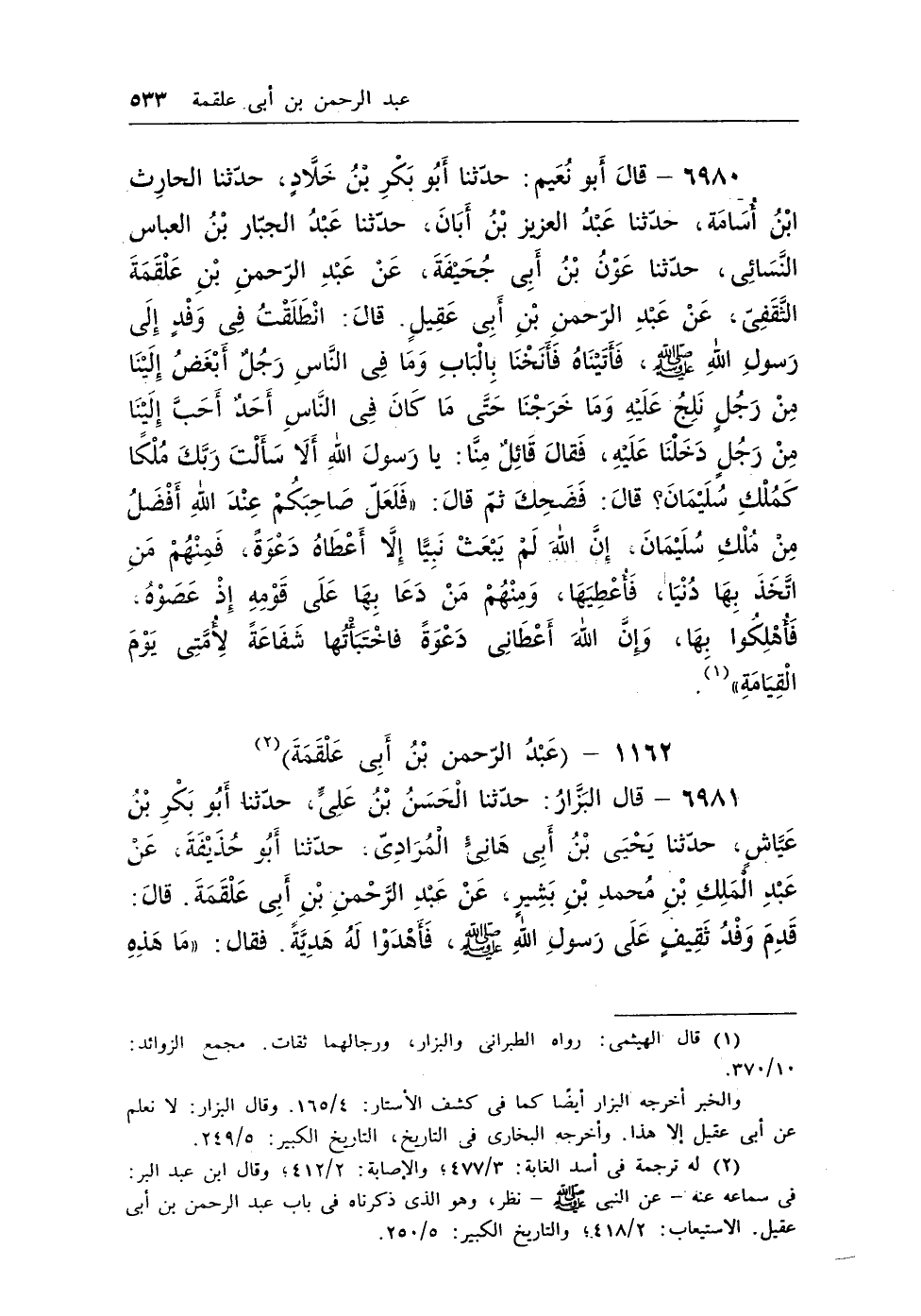 (¬2) له ترجمة فى أسد الغابة: 3/477؛ والإصابة: 2/412؛ وقال ابن عبد البر: فى سماعه عنه ـ عن النبى - صلى الله عليه وسلم - ـ نظر، وهو الذى ذكرناه فى باب عبد الرحمن بن أبى عقيل. الاستيعاب: 2/418؛ والتاريخ الكبير: 5/250.