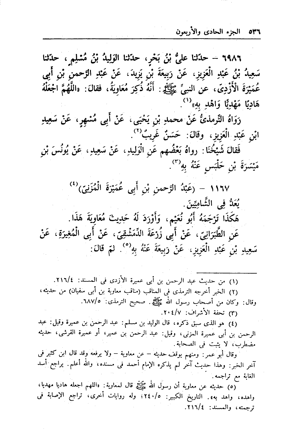 (¬5) حديثه عن معاوية أن رسول الله - صلى الله عليه وسلم - قال لمعاوية: «اللهم اجعله هاديا مهديا، واهده، واهد به» . التاريخ الكبير: 5/240؛ وله روايات أخرى، تراجع الإصابة فى ترجمته، والمسند: 4/216.