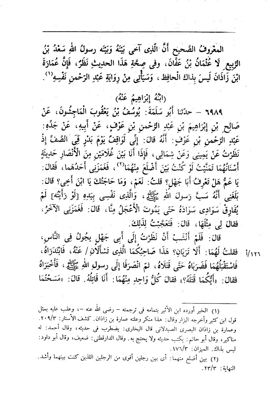 6989 - حدثنا أبو سلمة: يوسف بن يعقوب الماجشون، عن صالح بن إبراهيم بن عبد الرحمن بن عوفٍ، عن أبيه، عن جده: عبد الرحمن بن عوفٍ: أنه قال: إنى لواقف يوم بدرٍ فى الصف إذ نظرت عن يمينى وعن شمالى، فإذا أنا بين غلامين من الأنصار حديثةٍ أسنانهما تمنيت لو كنت بين أضلع منهما (¬1) ، فغمزنى أحدهما، فقال: يا عم هل تعرف أبا جهلٍ؟ قلت: نعم، وما حاجتك يا ابن أخى؟ قال: بلغنى أنه سب رسول الله - صلى الله عليه وسلم -، والذى نفسى بيده [لو رأيته] لم يفارق سوادى سواده حتى يموت الأعجل منا، قال: فغمزنى الآخر، فقال لى مثلها، قال: فتعجبت لذلك.
