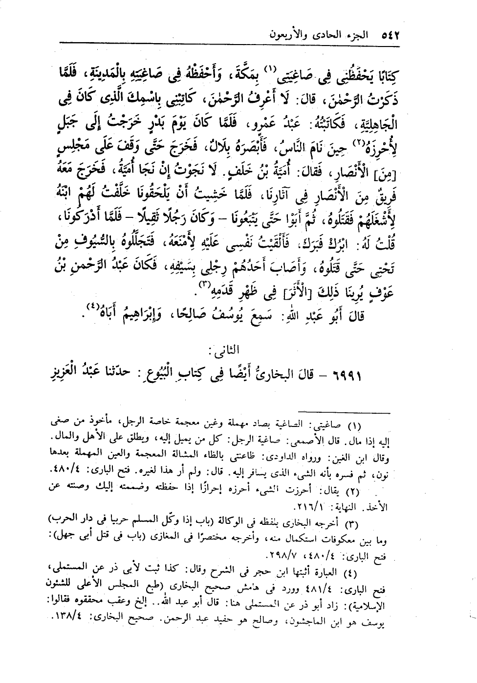 كتابًا يحفظنى فى صاغيتى (¬1) بمكة، وأحفظه فى صاغيته بالمدينة، فلما ذكرت الرحمن، قال: لا أعرف الرحمن، كاتبنى باسمك الذى كان فى الجاهلية، فكاتبته: عبد عمرو، فلما كان يوم بدرٍ خرجت إلى جبلٍ لأحرزه (¬2) حين نام الناس، فأبصره بلال، فخرج حتى وقف على مجلسٍ [من] الأنصار، فقال: أمية بن خلفٍ. لا نجوت إن نجا أمية، فخرج معه فريق من الأنصار فى آثارنا، فلما خشيت أن يلحقونا خلفت لهم ابنه لأشغلهم فقتلوه، ثم أبوا حتى يتبعونا ـ وكان رجلا ثقيلاً ـ فلما أدركونا، قلت له: ابرك فبرك، فألقيت نفسى عليه لأمنعه، فتجللوه بالسيوف من تحتى حتى قتلوه، وأصاب أحدهم رجلى بسيفه، فكان عبد الرحمن بن عوف يرينا ذلك [الأثر] فى ظهر قدمه (¬3) .