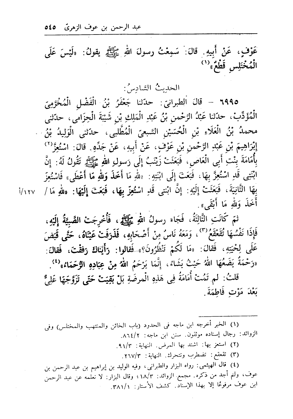 6995 - قال الطبرانى: حدثنا جعفر بن الفضل المخرمى المؤدب، حدثنا عبد الرحمن بن عبد الملك بن شيبة الحزامى، حدثنى محمد بن العلاء بن الحسين السبعى المطلبى، حدثنى الوليد بن إبراهيم بن عبد الرحمن بن عوفٍ، عن أبيه، عن جده. قال: استعز (¬1) بأمامة بنت أبى العاص، فبعثت زينب إلى رسول الله - صلى الله عليه وسلم - تقول له: إن ابنتى قد استعز بها، فبعث إلى ابنته: «للهِ مَا أَخَذَ وَللهِ مَا أَعْطَى» فاتعز بها الثانية، فبعثت إليه: إن ابنتى قد اتعز بها، فبعث إليها: «للهِ مَا/ أَخَذَ وَللهِ مَا أَبْقَى» .