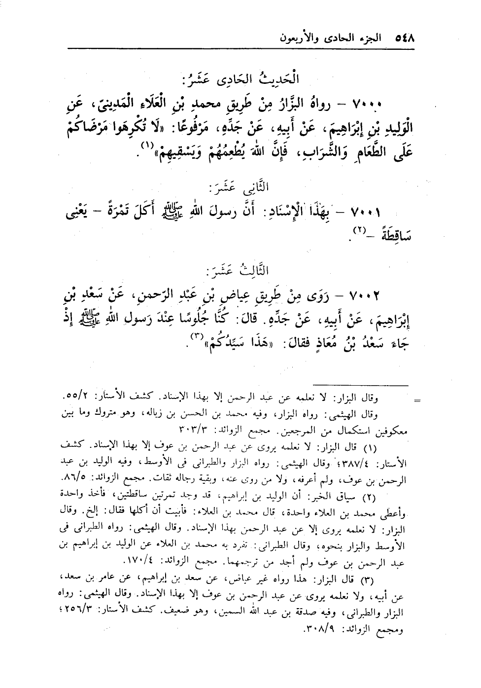 (¬3) قال البزار: هذا رواه غير عياض، عن سعد بن إبراهيم، عن عامر بن سعد، عن أبيه، ولا نعلمه يروى عن عبد الرحمن بن عوف إلا بهذا الإسناد. وقال الهيثمى: رواه البزار والطبرانى، وفيه صدقة بن عبد الله السمين، وهو ضعيف. كشف الأستار: 3/256؛ ومجمع الزوائد: 9/308.