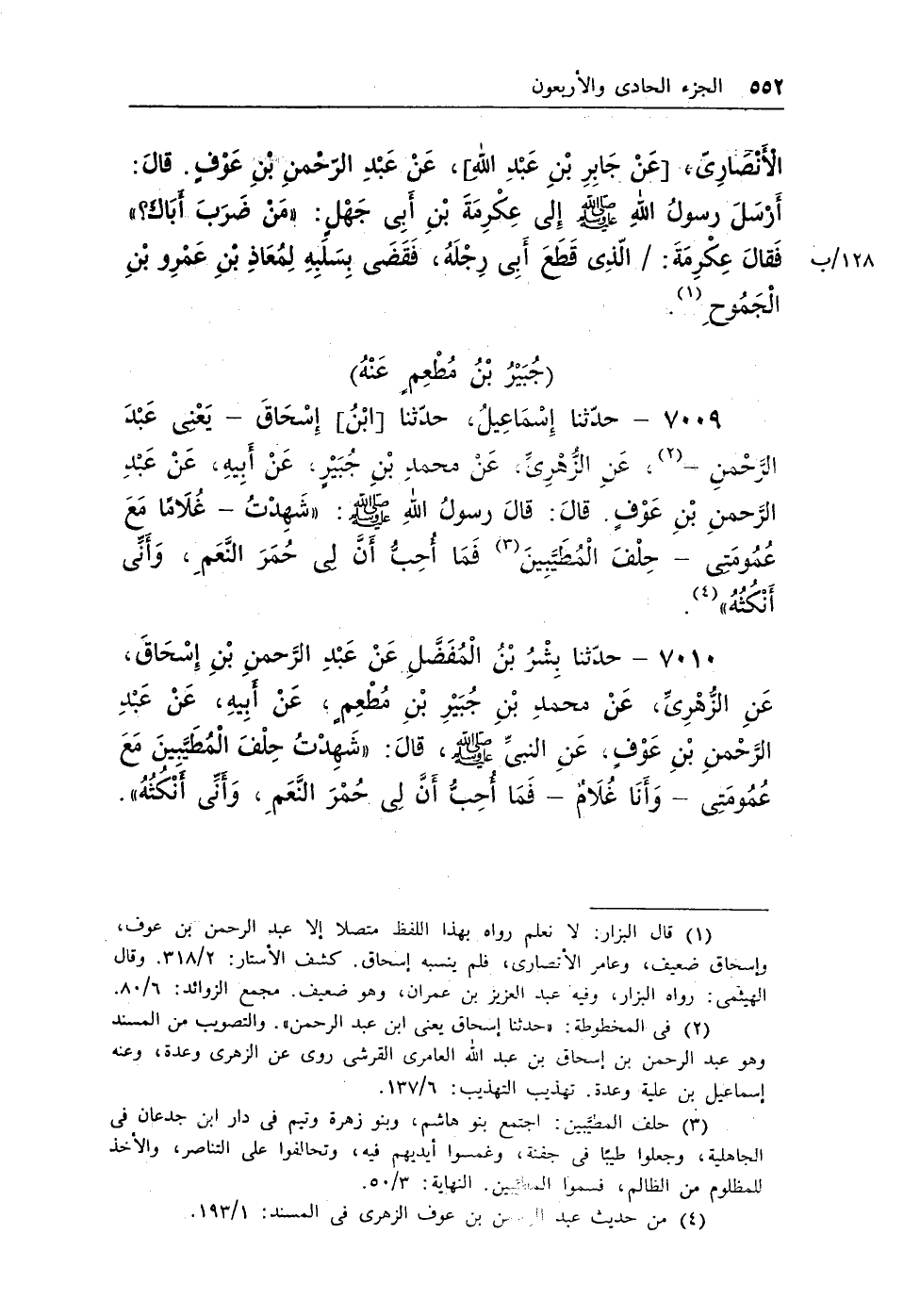 7010 - حدثنا بشر بن المفضل عن عبد الرحمن بن إسحاق، عن الزهرى، عن محمد بن جبير بن مطعمٍ، عن أبيه، عن عبد الرحمن بن عوف، عن النبى - صلى الله عليه وسلم -، قال: «شَهِدْتُ حِلْفَ الْمُطَيَّبينَ مَعَ عُمُومَتِى ـ وَأَنَا غُلاَمٌ ـ فَمَا أُحِبُّ أَنَّ لِى حُمَرَ النَّعَمِ، وَأَنِّى أَنْكُثُه» (¬3) .