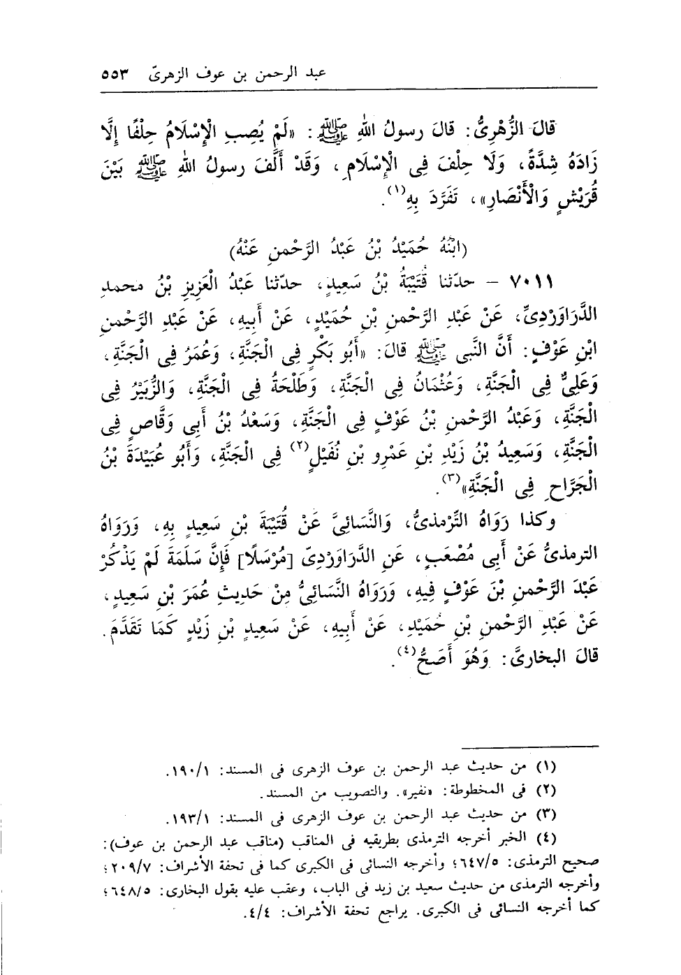 (¬3) الخبر أخرجه الترمذى بطريقيه فى المناقب (مناقب عبد الرحمن بن عوف) : صحيح الترمذى: 5/647؛ وأخرجه النسائى فى الكبرى كما فى تحفة الأشراف: 7/209؛ وأخرجه الترمذى من حديث سعيد بن زيد فى الباب، وعقب عليه بقول البخارى: 5/648؛ كما أخرجه النسائى فى الكبرى. يراجع تحفة الأشراف: 4/4.