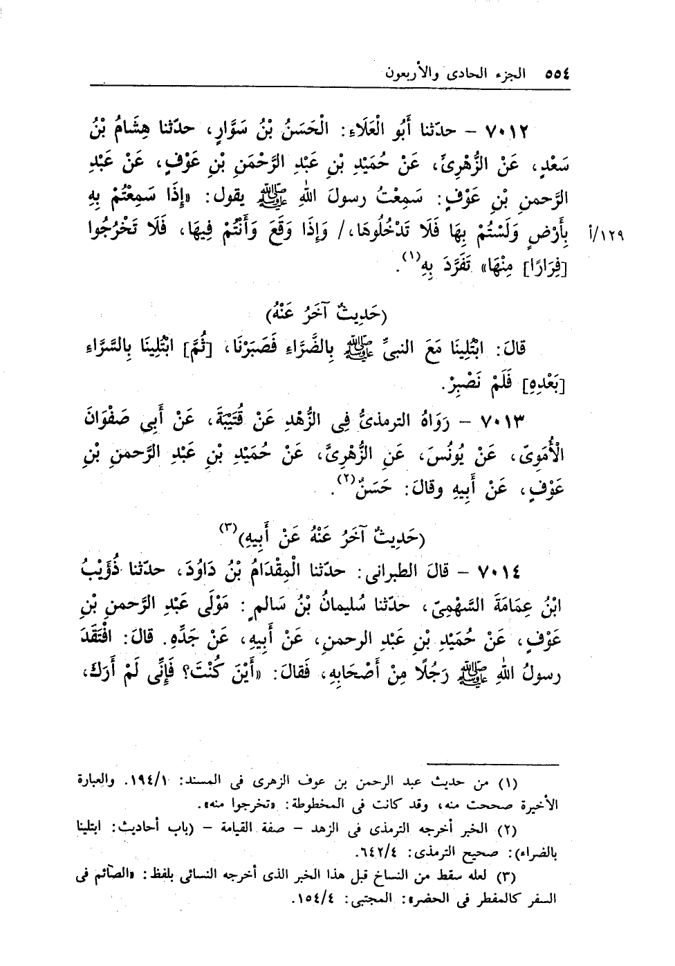7012 - حدثنا أبو العلاء: الحسن بن سوارٍ، حدثنا هشام بن سعد، عن الزهرى، عن حميد بن عبد الرحمن بن عوف، عن عبد الرحمن بن عوف: سمعت رسول الله - صلى الله عليه وسلم - يقول: «إِذَا سَمِعْتُمْ بِهِ بِأَرْضٍ وَلَسْتُمْ بِهَا فَلاَ تَدْخُلُوهًا، / وَإِذَا وَقَعَ وَأَنْتُمْ فِيهَا، فَلاَ تَخْرُجُوا [فِرَارًا] مِنْهَا» تفرد به (¬1) .