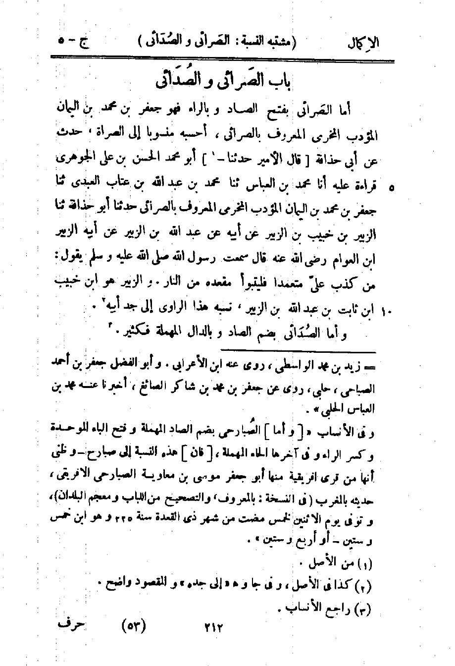 أما الصَرائي بفتح الصاد وبالراء فهو جعفر بن محمد بن اليمان المؤدب المخرمي المعروف بالصرائي، أحسبه منسوبا إلى الصراة، حدث عن أبي حذافة [قال الأمير حدثنا1] أبو محمد الحسن بن علي الجوهري قراءة عليه أنا محمد بن العباس ثنا محمد بن عبد الله بن عتاب العبدي ثنا جعفر بن محمد بن اليمان المؤدب المخرمي المعروف بالصرائي حدثنا أبو حذافة ثنا الزبير بن خبيب بن الزبير عن أبيه عن عبد الله بن الزبير عن أبيه الزبير بن العوام رضي الله عنه قال سمعت رسول الله -صلى الله عليه وسلم- يقول: "من كذب عليّ متعمدا فليتبوأ مقعده من النار". والزبير هو ابن خبيب بن ثابت بن عبد الله بن الزبير، نسبه هذا الراوي إلى جد أبيه2.