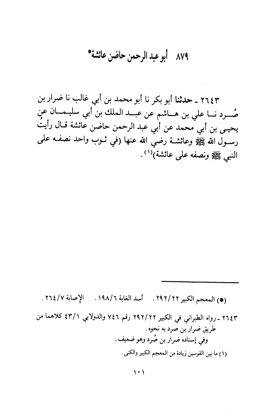 2643 - حَدَّثَنَا أَبُو بَكْرٍ، نا أَبُو مُحَمَّدِ بْنُ أَبِي غَالِبٍ، نا ضِرَارُ بْنُ صُرَدَ، نا عَلِيُّ بْنُ هَاشِمٍ، عَنْ عَبْدِ الْمَلِكِ بْنِ أَبِي سُلَيْمَانَ، عَنْ يَحْيَى أَبِي مُحَمَّدٍ، عَنْ أَبِي عَبْدِ الرَّحْمَنِ، حَاضِنِ عَائِشَةَ قَالَ: §رَأَيْتُ رَسُولَ اللَّهِ صَلَّى اللهُ عَلَيْهِ وَسَلَّمَ وَعَائِشَةَ رَضِيَ اللَّهُ عَنْهَا فِي ثَوْبٍ وَاحِدٍ نِصْفُهُ عَلَى النَّبِيِّ صَلَّى اللهُ عَلَيْهِ وَسَلَّمَ وَنِصْفُهُ عَلَى عَائِشَةَ