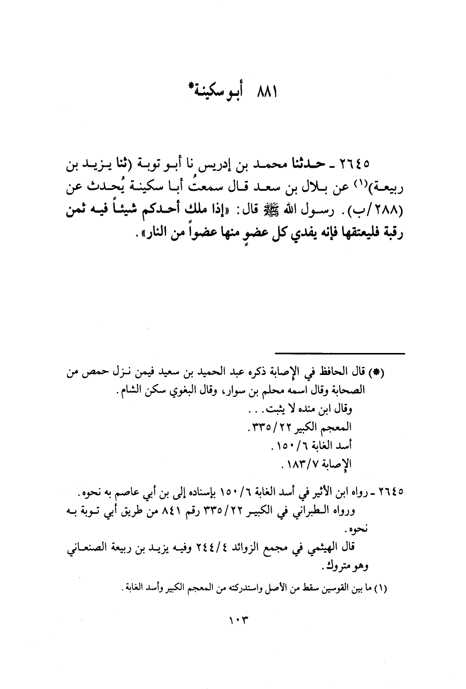 2645 - حَدَّثَنَا مُحَمَّدُ بْنُ إِدْرِيسَ، نا أَبُو تَوْبَةَ، ثنا يَزِيدُ بْنُ رَبِيعَةَ، عَنْ بِلَالِ بْنِ سَعْدٍ قَالَ: سَمِعْتُ أَبَا سَكِينَةَ، يُحَدِّثُ عَنْ رَسُولِ اللَّهِ صَلَّى اللهُ عَلَيْهِ وَسَلَّمَ قَالَ: «§إِذَا مَلَكَ أَحَدُكُمْ شَيْئًا فِيهِ ثَمَنُ رَقَبَةٍ فَلْيُعْتِقْهَا فَإِنَّهُ يُفَدِّي كُلُّ عُضْوٍ مِنْهَا عُضْوًا مِنَ النَّارِ»