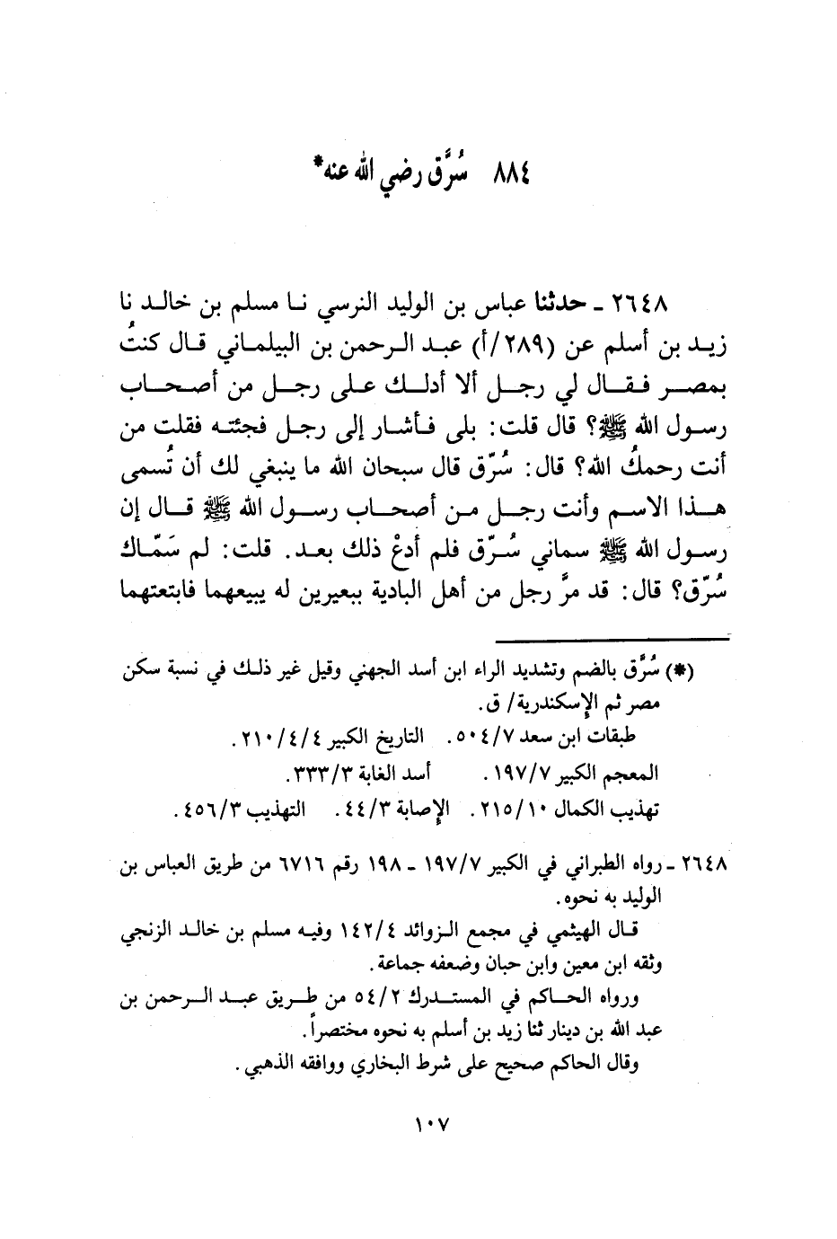 2648 - حَدَّثَنَا عَبَّاسُ بْنُ الْوَلِيدِ النَّرْسِيُّ، نا مُسْلِمُ بْنُ خَالِدٍ، نا زَيْدُ بْنُ أَسْلَمَ، عَنْ عَبْدِ الرَّحْمَنِ بْنِ الْبَيْلَمَانِيِّ قَالَ: كُنْتُ بِمِصْرَ فَقَالَ لِي رَجُلٌ: أَلَا أَدُلُّكَ عَلَى رَجُلٍ مِنْ أَصْحَابِ رَسُولِ اللَّهِ صَلَّى اللهُ عَلَيْهِ وَسَلَّمَ؟ قَالَ: قُلْتُ: بَلَى. فَأَشَارَ إِلَى رَجُلٍ فَجِئْتُهُ فَقُلْتُ: مَنْ أَنْتَ رَحِمَكَ اللَّهُ؟ قَالَ: سُرَّقٌ. قَالَ: سُبْحَانَ اللَّهِ مَا يَنْبَغِي لَكَ أَنْ تُسَمَّى هَذَا الِاسْمَ وَأَنْتَ رَجُلٌ مِنْ أَصْحَابِ رَسُولِ اللَّهِ صَلَّى اللهُ عَلَيْهِ وَسَلَّمَ. قَالَ: إِنَّ رَسُولَ اللَّهِ صَلَّى اللهُ عَلَيْهِ وَسَلَّمَ سَمَّانِي سُرَّقًا فَلَمْ أَدَعْ ذَلِكَ بَعْدُ. قُلْتُ: لِمَ سِمَّاكَ سُرَّقًا؟ قَالَ: قَدْ مَرَّ رَجُلٌ مِنْ أَهْلِ الْبَادِيَةِ بِبَعِيرَيْنِ لَهُ يَبِيعُهُمَا فَابْتَعْتُهُمَا -[108]- مِنْهُ وَقُلْتُ انْطَلِقْ مَعِي حَتَّى أُعْطِيَكَ فَدَخَلْتُ بَيْتِي فَخَرَجْتُ مِنْ خَلْفٍ لِي فَقَضَيْتُ بِثَمَنِ الْبَعِيرَيْنِ حَاجَتِي وَتَغَيَّبْتُ حَتَّى ظَنَنْتُ أَنَّ الْأَعْرَابِيَّ قَدْ خَرَجَ قَالَ: فَخَرَجْتُ وَالْأَعْرَابِيُّ مُقِيمٌ فَأَخَذَنِي فَقَدَّمَنِي إِلَى رَسُولِ اللَّهِ صَلَّى اللهُ عَلَيْهِ وَسَلَّمَ فَأَخْبَرَهُ الْخَبَرَ فَقَالَ النَّبِيُّ صَلَّى اللهُ عَلَيْهِ وَسَلَّمَ: «§مَا حَمَلَكَ عَلَى مَا صَنَعْتَ؟» قُلْتُ: قَضَيْتُ بِثَمَنِهَا حَاجَتِي. قَالَ: «فَاقْضِهِ» . قَالَ: فَقُلْتُ: لَيْسَ عِنْدِي. قَالَ «فَأَنْتَ سُرَّقٌ، اذْهَبْ بِهِ يَا أَعْرَابِيُّ فَبِعْهُ حَتَّى تَسْتَوْفِيَ حَقَّكَ» قَالَ: فَجَعَلَ يُسَاوِمُونَهُ بِي فَيَلْتَفِتُ إِلَيْهِمْ فَيَقُولُ: مَاذَا تُرِيدُونَ؟ قَالُوا: نُرِيدُ أَنْ نَفْدِيَهُ مِنْكَ. قَالَ: وَاللَّهِ إِنْ مِنْكُمْ مِنْ أَحَدٍ أَحْوَجَ إِلَيْهِ مِنِّي، اذْهَبْ فَقَدْ أَعْتَقْتُكَ