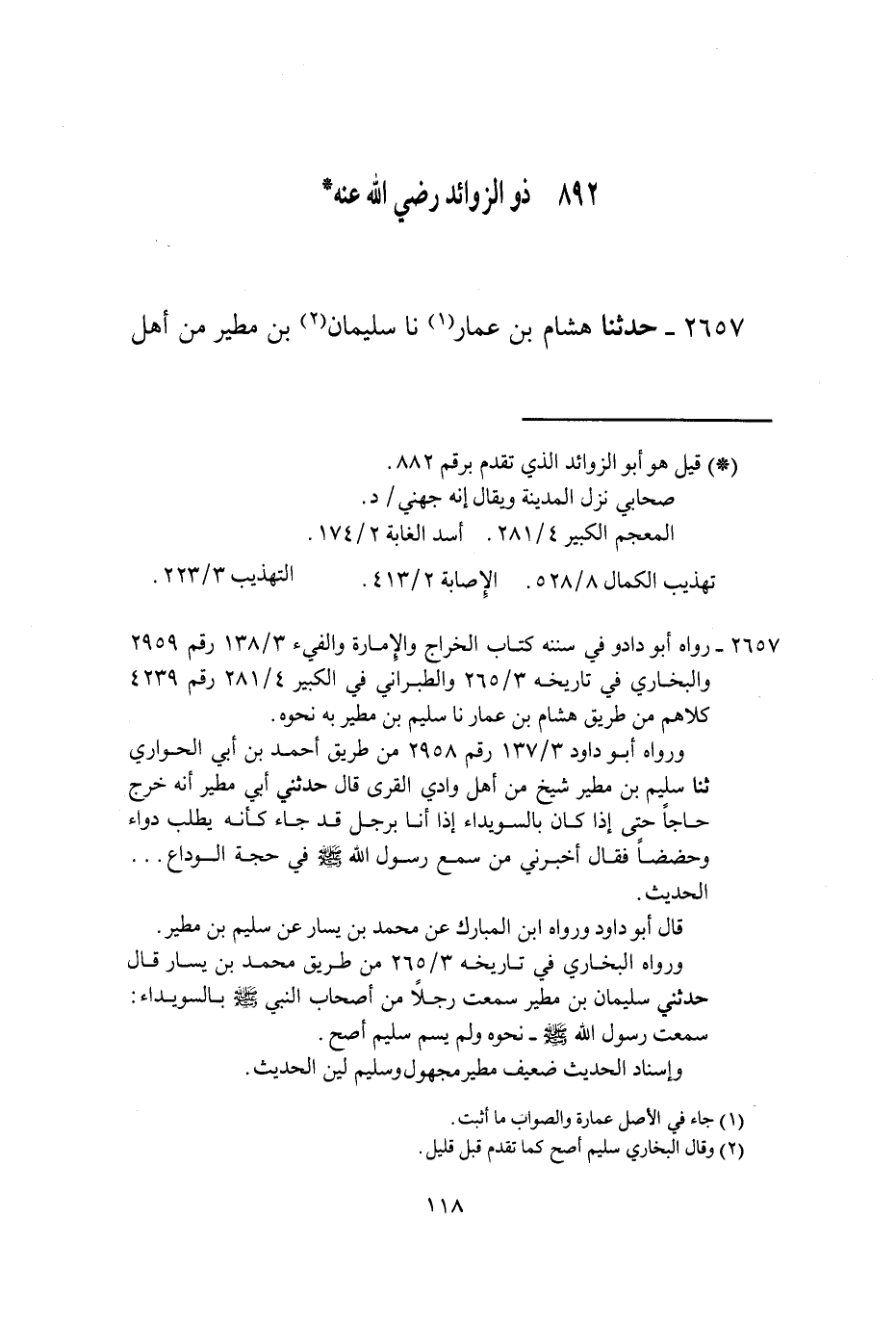 2657 - حَدَّثَنَا هِشَامُ بْنُ عَمَّارٍ، نا سُلَيْمَانُ بْنُ مَطِيرٍ، مِنْ أَهْلِ -[119]- وَادِي الْقُرَى، عَنْ أَبِيهِ، أَنَّهُ حَدَّثَهُ قَالَ: سَمِعْتُ رَجُلًا يَقُولُ: سَمِعْتُ رَسُولَ اللَّهِ صَلَّى اللهُ عَلَيْهِ وَسَلَّمَ يَقُولُ عَامَ حَجَّةِ الْوَدَاعِ أَمَرَ النَّاسَ وَنَهَاهُمْ ثُمَّ قَالَ: يَقُولُ: «هَلْ بَلَّغْتُ؟» قَالُوا: اللَّهُمَّ نَعَمْ، مَرَّتَيْنِ. قَالَ: «اللَّهُمَّ اشْهَدْ، اللَّهُمَّ اشْهَدْ» ثُمَّ قَالَ: §خُذُوا مِنَ الْإِعْطَاءِ مَا كَانَ عَطَاءً فَإِذَا تَجَاحَفَتْ قُرَيْشٌ بَيْنَهُمَا الْمُلْكَ وَعَادَ الْعَطَاءُ أَوْ كَانَ رِشَاءً عَنْ دِينِكُمْ فَدَعَوْهُ " فَقُلْتُ: مَنْ هَذَا؟ قَالُوا: هَذَا ذُو الزَّوَائِدِ صَاحِبُ رَسُولِ اللَّهِ صَلَّى اللهُ عَلَيْهِ وَسَلَّمَ