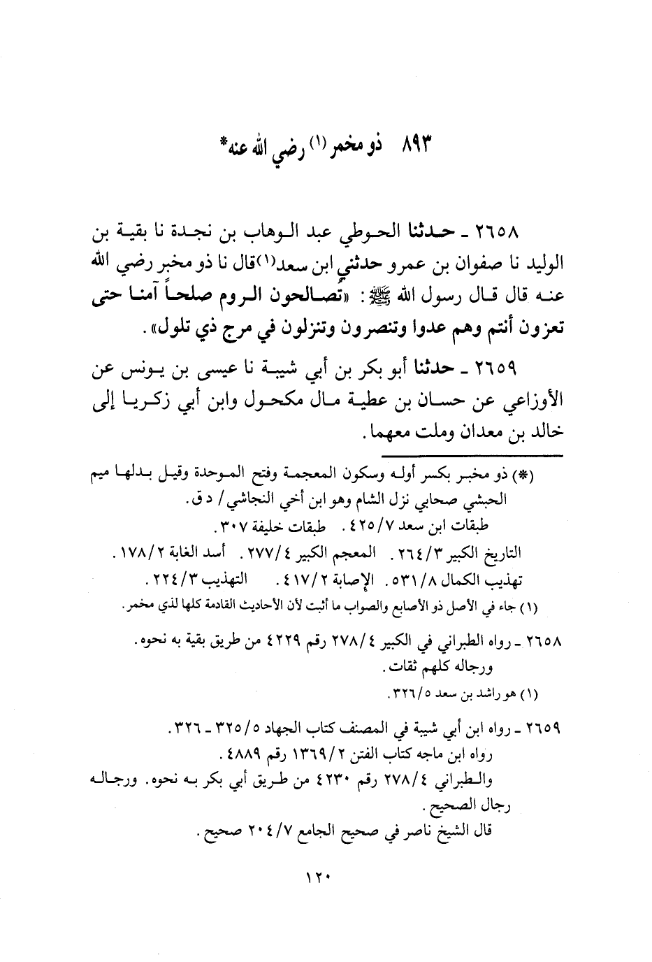 2659 - حَدَّثَنَا أَبُو بَكْرِ بْنُ أَبِي شَيْبَةَ، نا عِيسَى بْنُ يُونُسَ، عَنِ الْأَوْزَاعِيِّ، عَنْ حَسَّانَ بْنِ عَطِيَّةَ، مَالَ مَكْحُولٌ وَابْنُ أَبِي زَكَرِيَّا إِلَى خَالِدِ بْنِ مَعْدَانَ وَمِلْتُ مَعَهُمَا، فَحَدَّثَنَا عَنْ جُبَيْرِ بْنِ نُفَيْرٍ قَالَ: قَالَ لِي جُبَيْرُ بْنُ نُفَيْرٍ: انْطَلِقْ بِنَا إِلَى ذُو مِخْمَرٍ وَكَانَ رَجُلًا مِنْ أَصْحَابِ النَّبِيِّ صَلَّى اللهُ عَلَيْهِ وَسَلَّمَ قَالَ: فَانْطَلَقْتُ مَعَهُ فَسَأَلَهُ جُبَيْرٌ عَنِ الْهُدْنَةِ فَقَالَ: سَمِعْتُ رَسُولَ اللَّهِ صَلَّى اللهُ عَلَيْهِ وَسَلَّمَ يَقُولُ: " §تُصَالِحُونَ الرُّومَ صُلْحًا آمِنًا ثُمَّ تَغْزُونَ أَنْتُمْ وَهُمْ عَدُوًّا تُنْصَرُونَ وَتَغْنَمُونَ وَتَسْلَمُونَ ثُمَّ تَنْصَرِفُونَ حَتَّى تَنْزِلُونَ بِمَرْجِ ذِي تُلُولٍ فَيَرْفَعُ رَجُلٌ مِنْ أَهْلِ النَّصْرَانِيَّةِ الصَّلِيبَ وَيَقُولُ: غَلَبَ الصَّلِيبُ. فَيَغْضَبُ رَجُلٌ مِنَ الْمُسْلِمِينَ فَيَقُومُ إِلَيْهِ فَيَدُقُّهُ فَعِنْدَ ذَلِكَ يَغْدِرُ الرُّومُ وَيَجْمَعُونَ لِلْمَلْحَمَةِ "