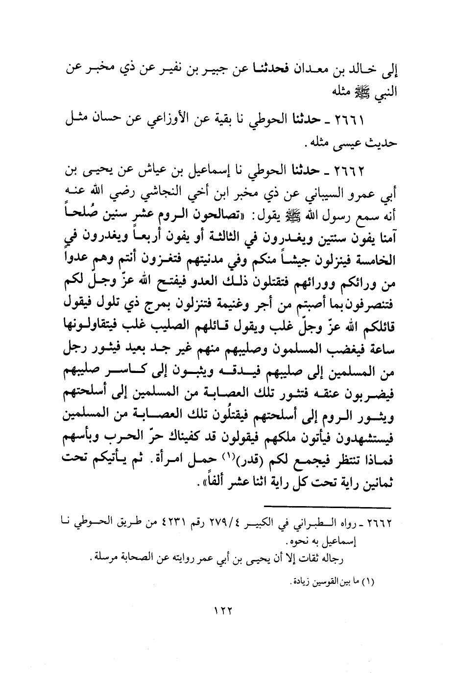 2662 - حَدَّثَنَا الْحَوْطِيُّ، نا إِسْمَاعِيلُ بْنُ عَيَّاشٍ، عَنْ يَحْيَى بْنِ أَبِي عَمْرٍو السَّيْبَانِيِّ، عَنْ ذِي مِخْمَرِ ابْنِ أَخِي النَّجَاشِيِّ رَضِيَ اللَّهُ عَنْهُ، أَنَّهُ سَمِعَ رَسُولَ اللَّهِ صَلَّى اللهُ عَلَيْهِ وَسَلَّمَ يَقُولُ: " §تُصَالِحُونَ الرُّومَ عَشْرَ سِنِينَ صُلْحًا آمِنًا يَفُونَ سَنَتَيْنِ وَيَغْدِرُونَ فِي الثَّالِثَةِ أَوْ يَفُونَ أَرْبَعًا وَيَغْدِرُونَ فِي الْخَامِسَةِ فَيَنْزِلُونَ جَيْشًا مِنْكُمْ وَفِي مَدِينَتِهِمْ فَتَغْزُونَ أَنْتُمْ وَهُمْ عَدُوًّا مِنْ وَرَائِكُمْ وَوَرَائِهِمْ فَتَقْتُلُونَ ذَلِكَ الْعَدُوَّ فَيَفْتَحُ اللَّهُ عَزَّ وَجَلَّ لَكُمْ فَتَنْصَرِفُونَ بِمَا أَصَبْتُمْ مِنْ أَجْرٍ وَغَنِيمَةٍ فَتَنْزِلُونَ بِمَرْجِ ذِي تُلُولٍ فَيَقُولُ قَائِلُكُمْ: اللَّهُ عَزَّ وَجَلَّ غَلَبَ وَيَقُولُ قَائِلُهُمْ: الصَّلِيبُ غَلَبَ فَيَتَقَاوَلُونَهَا سَاعَةً فَيَغْضَبُ الْمُسْلِمُونَ وَصَلِيبُهُمْ مِنْهُمْ غَيْرُ جَدِّ بَعِيدٍ فَيَثُورُ رَجُلٌ مِنَ الْمُسْلِمِينَ إِلَى صَلِيبِهِمْ فَيَدُقُّهُ وَيَثِبُونَ إِلَى كَاسِرِ صَلِيبِهِمْ فَيَضْرِبُونَ عُنُقَهُ فَتَثُورُ تِلْكَ الْعِصَابَةُ مِنَ الْمُسْلِمِينَ إِلَى أَسْلِحَتِهِمْ وَيَثُورُ الرُّومُ إِلَى أَسْلِحَتِهِمْ فَيَقْتُلُونَ تِلْكَ الْعِصَابَةَ مِنَ الْمُسْلِمِينَ فَيُسْتَشْهَدُونَ فَيَأْتُونَ مَلِكَهُمْ فَيَقُولُونَ قَدْ كَفَيْنَاكَ حَرَّ الْحَرْبِ وَبَأْسَهُمْ فَمَاذَا تَنْتَظِرُ فَيَجْمَعُ لَكُمْ قَدْرَ حَمْلِ امْرَأَةٍ ثُمَّ يَأْتِيكُمْ تَحْتَ ثَمَانِينَ رَايَةً تَحْتَ كُلِّ رَايَةٍ اثْنَا عَشَرَ أَلْفًا "