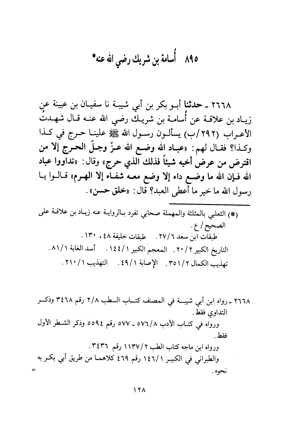 2668 - حَدَّثَنَا أَبُو بَكْرِ بْنُ أَبِي شَيْبَةَ، نا سُفْيَانُ بْنُ عُيَيْنَةَ، عَنْ زِيَادِ بْنِ عِلَاقَةَ، عَنْ أُسَامَةَ بْنِ شَرِيكٍ، رَضِيَ اللَّهُ عَنْهُ قَالَ: شَهِدْتُ الْأَعْرَابَ يَسْأَلُونَ رَسُولَ اللَّهِ صَلَّى اللهُ عَلَيْهِ وَسَلَّمَ: عَلَيْنَا حَرَجٌ فِي كَذَا وَكَذَا؟ فَقَالَ لَهُمْ: «عِبَادَ اللَّهِ، وَضَعَ اللَّهُ عَزَّ وَجَلَّ الْحَرَجَ إِلَّا مَنِ اقْتَرَضَ مِنْ عِرْضِ أَخِيهِ شَيْئًا فَذَلِكَ الَّذِي حَرَّجَ» وَقَالَ: «§تَدَاوَوْا عِبَادَ اللَّهِ، فَإِنَّ اللَّهَ مَا وَضَعَ دَاءً إِلَّا وَضَعَ مَعَهُ شِفَاءٌ إِلَّا الْهَرَمُ» قَالُوا: يَا رَسُولَ اللَّهِ، مَا خَيْرُ مَا أُعْطِيَ الْعَبْدُ؟ قَالَ: «خُلُقٌ حَسَنٌ»