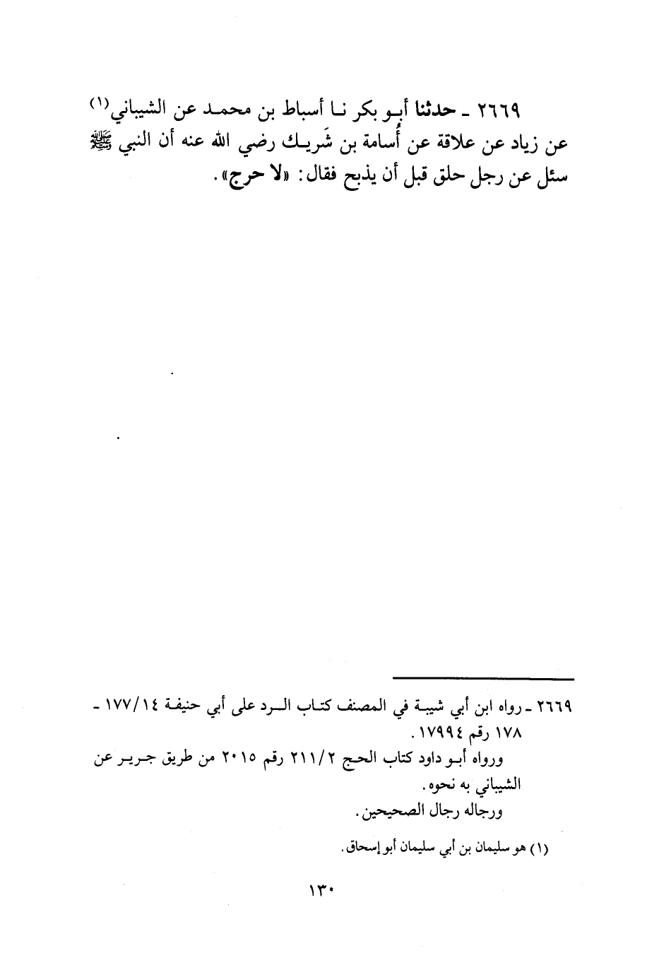 2669 - حَدَّثَنَا أَبُو بَكْرٍ، نا أَسْبَاطُ بْنُ مُحَمَّدٍ، عَنِ الشَّيْبَانِيِّ، عَنْ زِيَادِ بْنِ عِلَاقَةَ، عَنْ أُسَامَةَ بْنِ شَرِيكٍ، رَضِيَ اللَّهُ عَنْهُ، أَنَّ النَّبِيَّ صَلَّى اللهُ عَلَيْهِ وَسَلَّمَ §سُئِلَ عَنْ رَجُلٍ حَلَقَ قَبْلَ أَنْ يَذْبَحَ فَقَالَ: «لَا حَرَجَ»