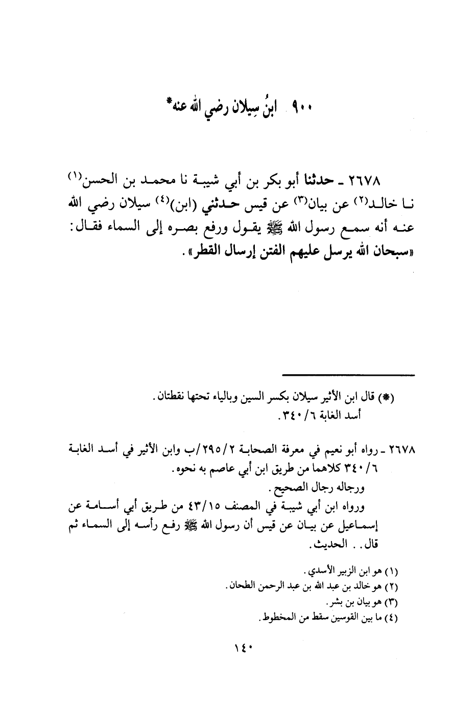 2678 - حَدَّثَنَا أَبُو بَكْرِ بْنُ أَبِي شَيْبَةَ، نا مُحَمَّدُ بْنُ الْحَسَنِ، نا خَالِدٌ، عَنْ بَيَانٍ، عَنْ قَيْسٍ، حَدَّثَنِي ابْنُ سِيلَانَ، رَضِيَ اللَّهُ عَنْهُ أَنَّهُ سَمِعَ رَسُولَ اللَّهِ صَلَّى اللهُ عَلَيْهِ وَسَلَّمَ يَقُولُ وَرَفَعَ بَصَرَهُ إِلَى السَّمَاءِ فَقَالَ: «سُبْحَانَ اللَّهِ §يُرْسِلُ عَلَيْهِمُ الْفِتَنَ إِرْسَالِ الْقَطْرِ»