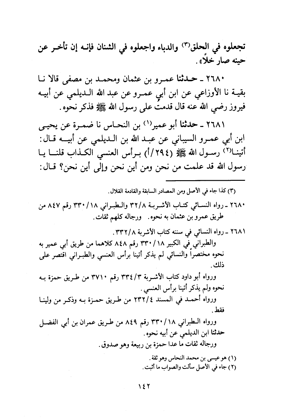 2681 - حَدَّثَنَا أَبُو عُمَيْرِ بْنُ النُّحَاسِ، نا ضَمْرَةُ، عَنْ يَحْيَى بْنِ أَبِي عَمْرٍو السَّيْبَانِيِّ، عَنْ عَبْدِ اللَّهِ بْنِ الدَّيْلَمِيِّ، عَنْ أَبِيهِ قَالَ: أَتَيْنَا رَسُولَ اللَّهِ صَلَّى اللهُ عَلَيْهِ وَسَلَّمَ بِرَأْسِ الْعَنْسِيِّ الْكَذَّابِ، قُلْنَا: يَا رَسُولَ اللَّهِ، قَدْ عَلِمْتَ مَنْ نَحْنُ وَمِنْ أَيْنَ نَحْنُ وَإِلَى أَيْنَ نَحْنُ؟ قَالَ: «إِلَى اللَّهِ تَعَالَى وَإِلَى رَسُولِهِ» قُلْنَا: يَا رَسُولَ اللَّهِ، إِنَّ لَنَا أَعْنَابًا فَمَا نَصْنَعُ بِهَا؟ قَالَ: «زَبِّبُوهَا» قُلْنَا: وَمَا نَصْنَعُ بِالزَّبِيبِ؟ قَالَ: §انْبِذُوهُ عَلَى غَدَائِكُمْ وَاشْرَبُوهُ عَلَى عَشَائِكُمُ انْبِذُوهُ عَلَى عَشَائِكُمْ وَإِذَا تَأَخَّرَ فَإِنَّهُ عَلَى أَصْلِهِ صَارَ خَلًّا " قَالَ ضَمْرَةُ: بَلَغَنِي أَنَّهُمْ جَعَلُوا رَأْسَهُ حِلَقًا حِلَقًا. يَعْنِي رَأْسَ الْأَسْوَدِ الْعَنْسِيِّ