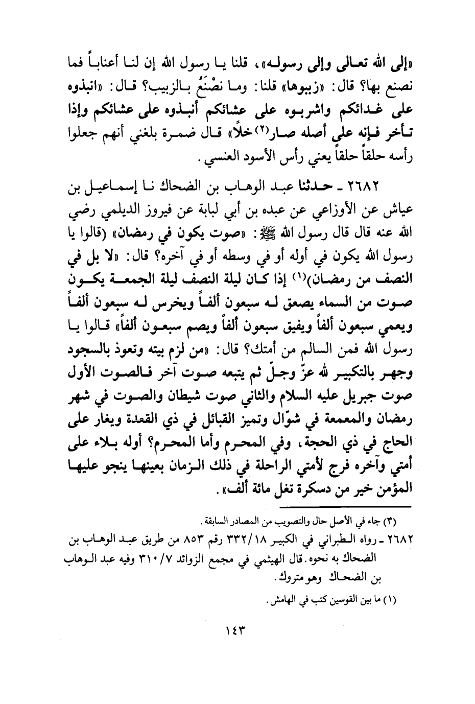 2682 - حَدَّثَنَا عَبْدُ الْوَهَّابِ بْنُ الضَّحَّاكِ، نا إِسْمَاعِيلُ بْنُ عَيَّاشٍ، عَنِ الْأَوْزَاعِيِّ، عَنْ عَبْدَةَ بْنِ أَبِي لُبَابَةَ، عَنْ فَيْرُوزٍ الدَّيْلَمِيِّ، رَضِيَ اللَّهُ عَنْهُ قَالَ: قَالَ رَسُولُ اللَّهِ صَلَّى اللهُ عَلَيْهِ وَسَلَّمَ: «صَوْتٌ يَكُونُ فِي رَمَضَانَ» قَالُوا: يَا رَسُولَ اللَّهِ، يَكُونُ فِي أَوَّلِهِ أَوْ فِي وَسَطِهِ أَوْ فِي آخِرِهِ؟ قَالَ: لَا، بَلْ فِي النِّصْفِ مِنْ رَمَضَانَ، إِذَا كَانَ لَيْلَةُ النِصْفِ لَيْلَةَ الْجُمُعَةِ يَكُونُ صَوْتٌ مِنَ السَّمَاءِ يُصْعَقُ لَهُ سَبْعُونَ أَلْفًا، وَيُخْرَسُ لَهُ سَبْعُونَ أَلْفًا، وَيُعْمَى سَبْعُونَ أَلْفًا، وَيُفِيقُ سَبْعُونَ أَلْفًا، وَيُصَمُّ سَبْعُونَ أَلْفًا " قَالُوا: يَا رَسُولَ اللَّهِ، §فَمَنِ السَّالِمُ مِنْ أُمَّتِكَ؟ قَالَ: «مَنْ لَزِمَ بَيْتَهُ وَتَعَوَّذَ بِالسُّجُودِ وَجَهَرَ بِالتَّكْبِيرِ لِلَّهِ عَزَّ وَجَلَّ، ثُمَّ يَتْبَعُهُ صَوْتٌ آخَرُ، فَالصَّوْتُ الْأَوَّلُ صَوْتُ جِبْرِيلَ عَلَيْهِ السَّلَامُ وَالثَّانِي صَوْتُ شَيْطَانٍ، وَالصَّوْتُ فِي شَهْرِ رَمَضَانَ، وَالْمَعْمَعَةُ فِي شَوَّالٍ، وَتَمَيُّزُ الْقَبَائِلِ فِي ذِي الْقَعْدَةِ، وَيُغَارُ عَلَى الْحَاجِّ فِي ذِي الْحِجَّةِ وَفِي الْمُحَرَّمِ، وَأَمَّا الْمُحَرَّمُ أَوَّلُهُ بَلَاءٌ عَلَى أُمَّتِي وَآخِرُهُ فَرَجٌ لِأُمَّتِي،، الرَّاحِلَةُ فِي ذَلِكَ الزَّمَانِ بِعَيْنِهَا يَنْجُو عَلَيْهَا الْمُؤْمِنُ خَيْرٌ مِنْ دَسْكَرَةٍ تَغُلُّ مِائَةَ أَلْفٍ»