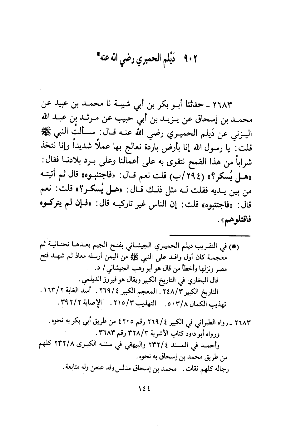 2683 - حَدَّثَنَا أَبُو بَكْرِ بْنُ أَبِي شَيْبَةَ، نا مُحَمَّدُ بْنُ عُبَيْدٍ، عَنْ مُحَمَّدِ بْنِ إِسْحَاقَ، عَنْ يَزِيدَ بْنِ أَبِي حَبِيبٍ، عَنْ مَرْثَدِ بْنِ عَبْدِ اللَّهِ الْيَزَنِيِّ، عَنْ دَيْلَمَ الْحِمْيَرِيِّ، رَضِيَ اللَّهُ عَنْهُ قَالَ: سَأَلْتُ النَّبِيَّ صَلَّى اللهُ عَلَيْهِ وَسَلَّمَ قُلْتُ: يَا رَسُولَ اللَّهِ، إِنَّا بِأَرْضٍ بَارِدَةٍ نُعَالِجُ بِهَا عَمَلًا شَدِيدًا وَإِنَّا نَتَّخِذُ شَرَابًا مِنْ هَذَا الْقَمْحِ نَتَقَوَّى بِهِ عَلَى أَعْمَالِنَا وَعَلَى بَرْدِ بِلَادِنَا. فَقَالَ: «§هَلْ يُسْكِرُ؟» قُلْتُ: نَعَمْ. قَالَ: «فَاجْتَنِبُوهُ» قَالَ: ثُمَّ أَتَيْتُهُ مِنْ بَيْنِ يَدَيْهِ فَقُلْتُ لَهُ مِثْلَ ذَلِكَ قَالَ: «هَلْ يُسْكِرُ؟» قُلْتُ: نَعَمْ. قَالَ: «فَاجْتَنِبُوهُ» قُلْتُ: إِنَّ النَّاسَ غَيْرُ تَارِكِيهِ قَالَ: «فَإِنْ لَمْ يَتْرُكُوهُ فَاقْتُلُوهُمْ»