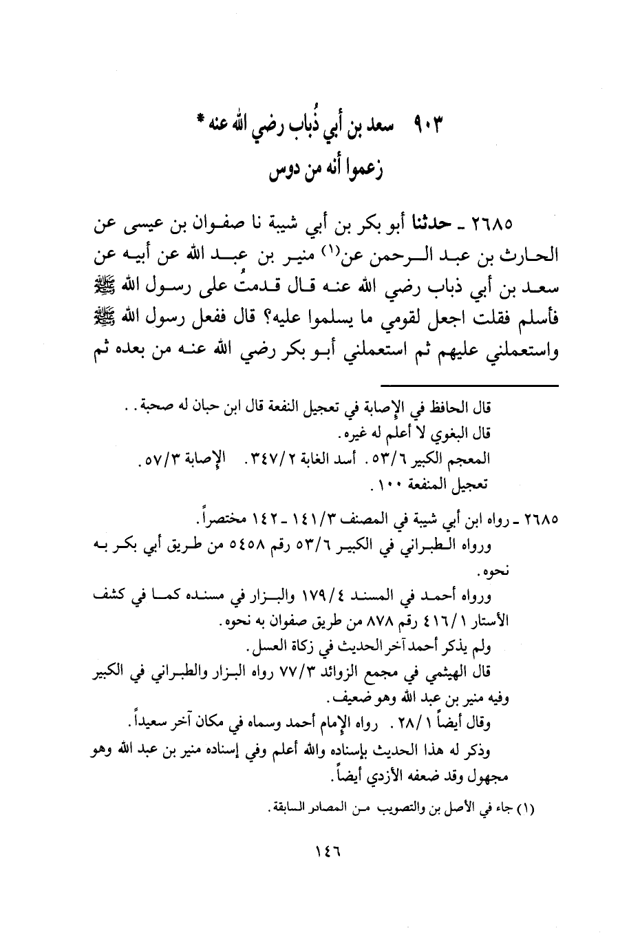 2685 - حَدَّثَنَا أَبُو بَكْرِ بْنُ أَبِي شَيْبَةَ، نا صَفْوَانُ بْنُ عِيسَى، عَنِ الْحَارِثِ بْنِ عَبْدِ الرَّحْمَنِ، عَنْ مُنِيرِ بْنِ عَبْدِ اللَّهِ، عَنْ أَبِيهِ، عَنْ سَعْدِ بْنِ أَبِي ذُبَابٍ، رَضِيَ اللَّهُ عَنْهُ قَالَ: قَدِمْتُ عَلَى رَسُولِ اللَّهِ صَلَّى اللهُ عَلَيْهِ وَسَلَّمَ فَأَسْلَمَ فَقُلْتُ: اجْعَلْ لِقَوْمِي مَا يُسْلِمُوا عَلَيْهِ. قَالَ: §فَفَعَلَ رَسُولُ اللَّهِ صَلَّى اللهُ عَلَيْهِ وَسَلَّمَ وَاسْتَعْمَلَنِي عَلَيْهِمْ ثُمَّ اسْتَعْمَلَنِي أَبُو بَكْرٍ رَضِيَ اللَّهُ عَنْهُ مِنْ بَعْدِهِ ثُمَّ اسْتَعْمَلَنِي عُمَرُ رَضِيَ اللَّهُ عَنْهُ مِنْ بَعْدِهِ قَالَ: فَقَدِمَ عَلَى قَوْمِهِ فَقَالَ لَهُمْ: فِي الْعَسَلِ زَكَاةٌ فَإِنَّهُ لَا خَيْرَ فِي مَالٍ لَا يُزَكَّى. قَالَ: فَقَالُوا لِي: كَمْ تَرَى؟ قُلْتُ: الْعُشْرَ. قَالَ: فَأَخَذَ مِنْهُمُ الْعُشْرَ فَقَدِمَ بِهِ عَلَى عُمَرَ رَضِيَ اللَّهُ عَنْهُ وَأَخْبَرَهُ بِمَا فِيهِ فَأَخَذَهُ عُمَرُ فَطَرَحَهُ فِي صَدَقَاتِ الْمُسْلِمِينَ