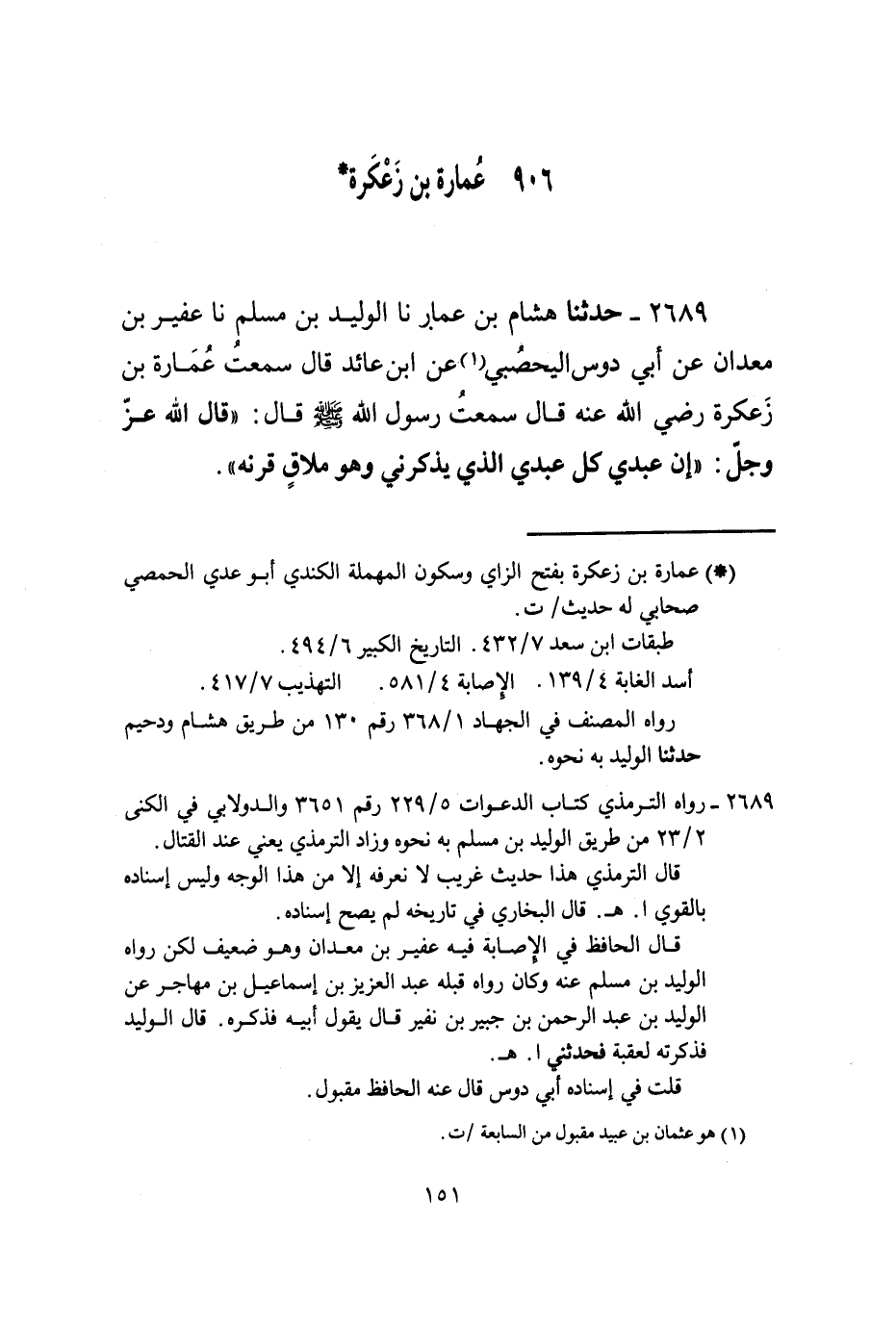 2689 - حَدَّثَنَا هِشَامُ بْنُ عَمَّارٍ، نا الْوَلِيدُ بْنُ مُسْلِمٍ، نا عُفَيْرُ بْنُ مَعْدَانَ، عَنْ أَبِي دَوْسٍ الْيَحْصُبِيِّ، عَنِ ابْنِ عَائِدٍ قَالَ: سَمِعْتُ عُمَارَةَ بْنَ زَعْكَرَةَ، رَضِيَ اللَّهُ عَنْهُ قَالَ: سَمِعْتُ رَسُولَ اللَّهِ صَلَّى اللهُ عَلَيْهِ وَسَلَّمَ قَالَ: " قَالَ اللَّهُ عَزَّ وَجَلَّ: إِنَّ §عَبْدِي كُلَّ عَبْدِي الَّذِي يَذْكُرْنِي وَهُوَ مُلَاقٍ قِرْنَهُ "