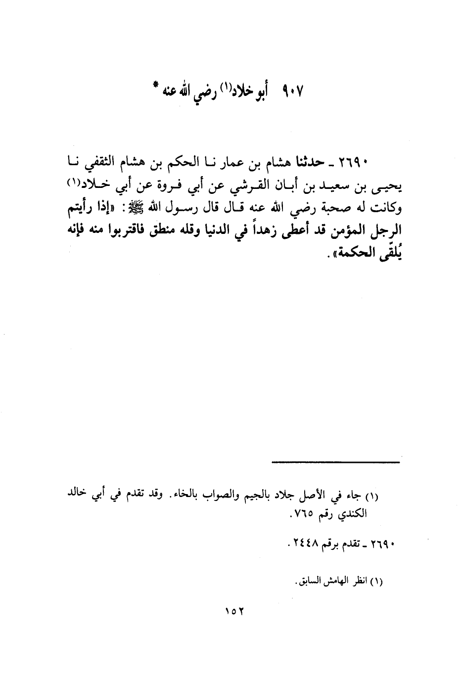 2690 - حَدَّثَنَا هِشَامُ بْنُ عَمَّارٍ، نا الْحَكَمُ بْنُ هِشَامٍ الثَّقَفِيُّ، نا يَحْيَى بْنُ سَعِيدِ بْنِ أَبَانَ الْقُرَشِيُّ، عَنْ أَبِي فَرْوَةَ، عَنْ أَبِي خَلَّادٍ، وَكَانَتْ لَهُ صُحْبَةٌ رَضِيَ اللَّهُ عَنْهُ قَالَ: قَالَ رَسُولُ اللَّهِ صَلَّى اللهُ عَلَيْهِ وَسَلَّمَ: «§إِذَا رَأَيْتُمُ الرَّجُلَ الْمُؤْمِنَ قَدْ أُعْطِيَ زُهْدًا فِي الدُّنْيَا وَقِلَّةَ مَنْطِقٍ فَاقْتَرِبُوا مِنْهُ فَإِنَّهُ يُلَقَّى الْحِكْمَةَ»