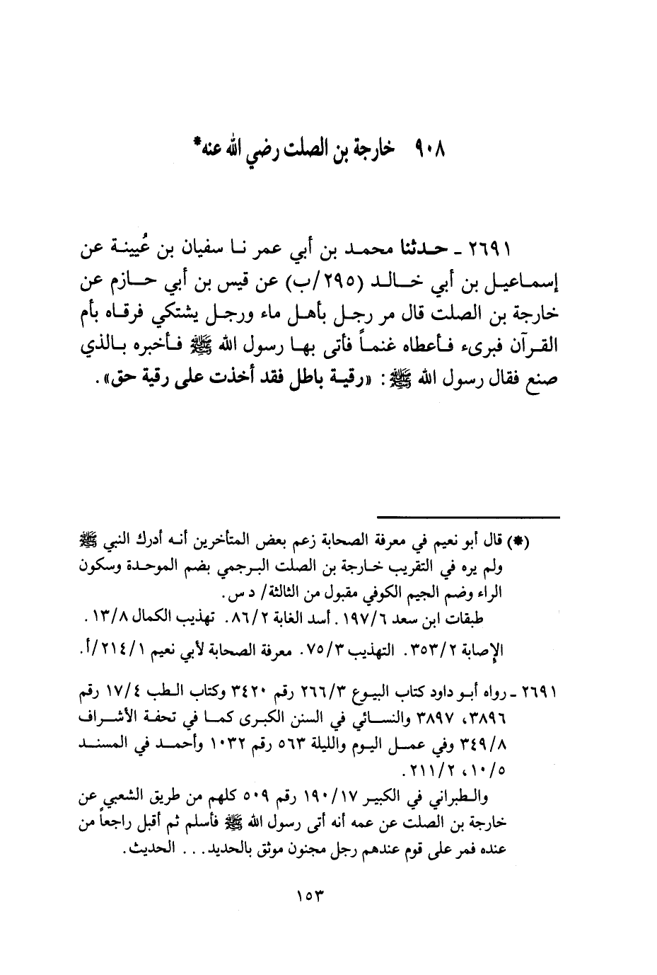 2691 - حَدَّثَنَا مُحَمَّدُ بْنُ أَبِي عُمَرَ، نا سُفْيَانُ بْنُ عُيَيْنَةَ، عَنْ إِسْمَاعِيلَ بْنِ أَبِي خَالِدٍ، عَنْ قَيْسِ بْنِ أَبِي حَازِمٍ، عَنْ خَارِجَةَ بْنِ الصَّلْتِ قَالَ: مَرَّ رَجُلٌ بِأَهْلِ مَاءٍ وَرَجُلٌ يَشْتَكِي فَرَقَاهُ بِأُمِّ الْقُرْآنِ فَبَرِئَ فَأَعْطَاهُ غَنَمًا فَأَتَى بِهَا رَسُولَ اللَّهِ صَلَّى اللهُ عَلَيْهِ وَسَلَّمَ فَأَخْبَرَهُ بِالَّذِي صَنَعَ فَقَالَ رَسُولُ اللَّهِ صَلَّى اللهُ عَلَيْهِ وَسَلَّمَ: «§رُقْيَةُ بَاطِلٍ فَقَدْ أُخِذَتْ عَلَى رُقْيَةِ حَقٍّ»