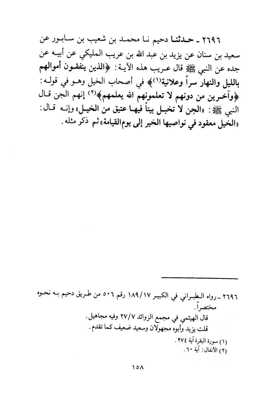 2696 - حَدَّثَنَا دُحَيْمٌ، نا مُحَمَّدُ بْنُ شُعَيْبِ بْنِ شَابُورَ، عَنْ سَعِيدِ بْنِ سِنَانٍ، عَنْ يَزِيدَ بْنِ عَبْدِ اللَّهِ بْنِ عُرَيْبٍ الْمُلَيْكِيِّ، عَنْ أَبِيهِ، عَنْ جَدِّهِ، عَنِ النَّبِيِّ صَلَّى اللهُ عَلَيْهِ وَسَلَّمَ قَالَ عُرَيْبٌ هَذِهِ الْآيَةُ {§الَّذِينَ يُنْفِقُونَ أَمْوَالَهُمْ بِاللَّيْلِ وَالنَّهَارِ سِرًّا وَعَلَانِيَةً} [البقرة: 274] فِي أَصْحَابِ الْخَيْلِ وَهُوَ فِي قَوْلِهِ {وَآخَرِينَ مِنْ دُونِهُمْ لَا تَعْلَمُونَهُمُ اللَّهُ يَعْلَمُهُمْ} [الأنفال: 60] إِنَّهُمُ الْجِنُّ قَالَ النَّبِيُّ صَلَّى اللهُ عَلَيْهِ وَسَلَّمَ: «الْجِنُّ لَا تَخْبِلُ بَيْتًا فِيهَا عَتِيقٌ مِنَ الْخَيْلِ» وَإِنَّهُ قَالَ: الْخَيْلُ مَعْقُودٌ فِي نَوَاصِيهَا الْخَيْرُ إِلَى يَوْمِ الْقِيَامَةِ " ثُمَّ ذَكَرَ مِثْلَهُ