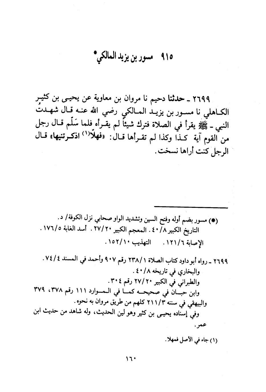 2699 - حَدَّثَنَا دُحَيْمٌ، نا مَرْوَانُ بْنُ مُعَاوِيَةَ، عَنْ يَحْيَى بْنِ كَثِيرٍ الْكَاهِلِيِّ، نا مِسْوَرُ بْنُ يَزِيدَ الْمَالِكِيُّ، رَضِيَ اللَّهُ عَنْهُ قَالَ: شَهِدْتُ النَّبِيَّ صَلَّى اللهُ عَلَيْهِ وَسَلَّمَ §يَقْرَأُ فِي الصَّلَاةِ فَتَرَكَ شَيْئًا لَمْ يَقْرَأْهُ فَلَمَّا سَلَّمَ قَالَ رَجُلٌ مِنَ الْقَوْمِ آيَةُ كَذَا وَكَذَا لَمْ تَقْرَأْهَا. قَالَ: «فَهَلَّا أَذْكَرْتَنِيهَا» قَالَ الرَّجُلُ: كُنْتُ أُرَاهَا نُسِخَتْ