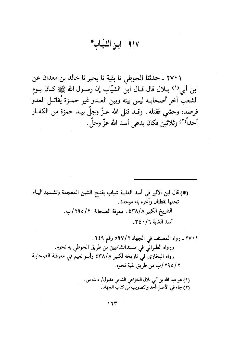 2701 - حَدَّثَنَا الْحَوْطِيُّ، نا بَقِيَّةُ، نا بُجَيْرٌ، نا خَالِدُ بْنُ مَعْدَانَ، عَنِ ابْنِ أَبِي بِلَالٍ قَالَ: قَالَ ابْنُ الشَّيَّابِ: إِنَّ رَسُولَ اللَّهِ صَلَّى اللهُ عَلَيْهِ وَسَلَّمَ كَانَ §يَوْمَ الشِّعْبِ آخِرَ أَصْحَابِهِ لَيْسَ بَيْنَهُ وَبَيْنِ الْعَدُوِّ غَيْرُ حَمْزَةَ يُقَاتِلُ الْعَدُوَّ فَرَصَدَهُ وَحْشِيٌّ فَقَتَلَهُ وَقَدْ قَتَلَ اللَّهُ عَزَّ وَجَلَّ بِيَدِ حَمْزَةَ مِنَ الْكُفَّارِ أَحَدًا وَثَلَاثِينَ فَكَانَ يُدْعَى أَسَدَ اللَّهِ عَزَّ وَجَلَّ
