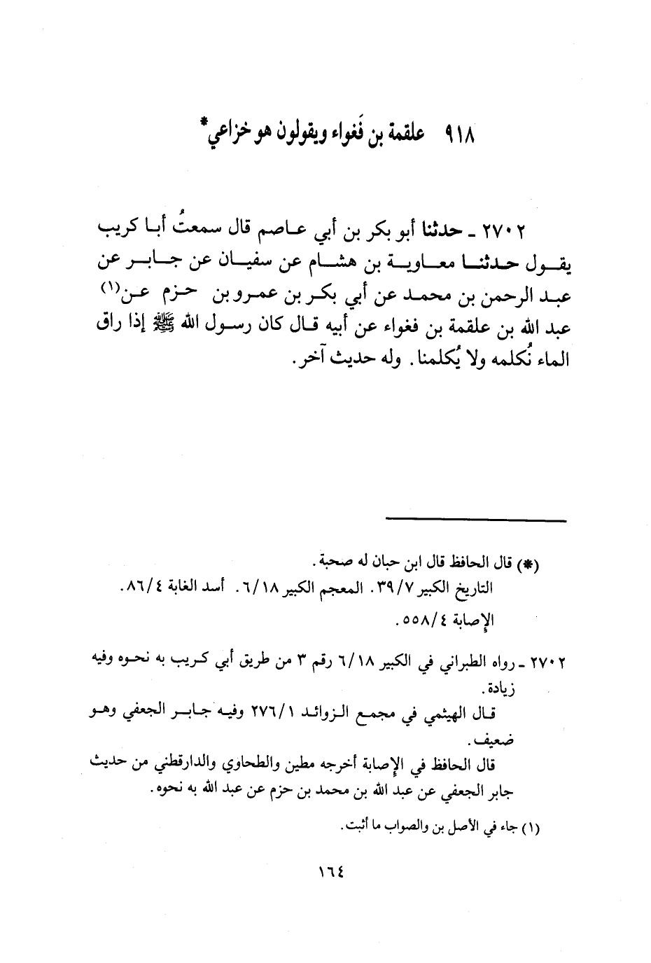 2702 - حَدَّثَنَا أَبُو بَكْرِ بْنُ أَبِي عَاصِمٍ قَالَ: سَمِعْتُ أَبَا كُرَيْبٍ يَقُولُ: حَدَّثَنَا مُعَاوِيَةُ بْنُ هِشَامٍ، عَنْ سُفْيَانَ، عَنْ جَابِرٍ، عَنْ عَبْدِ الرَّحْمَنِ بْنِ مُحَمَّدٍ، عَنْ أَبِي بَكْرِ بْنِ عَمْرِو بْنِ حَزْمٍ، عَنْ عَبْدِ اللَّهِ بْنِ عَلْقَمَةَ بْنِ فَغْوَاءَ، عَنْ أَبِيهِ قَالَ: كَانَ رَسُولُ اللَّهِ صَلَّى اللهُ عَلَيْهِ وَسَلَّمَ §إِذَا رَاقَ الْمَاءُ نُكَلِّمُهُ وَلَا يُكَلِّمُنَا وَلَهُ حَدِيثٌ آخَرُ