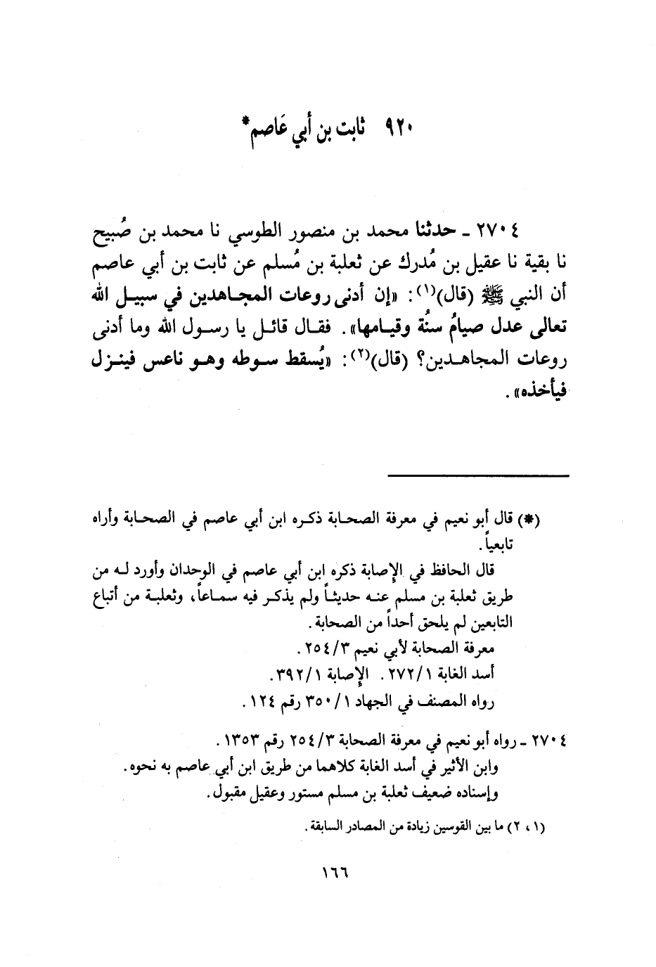 2704 - حَدَّثَنَا مُحَمَّدُ بْنُ مَنْصُورٍ الطُّوسِيُّ، نا مُحَمَّدُ بْنُ صُبَيْحٍ، نا بَقِيَّةُ، نا عَقِيلُ بْنُ مُدْرِكٍ، عَنْ ثَعْلَبَةَ بْنِ مُسْلِمٍ، عَنْ ثَابِتِ بْنِ أَبِي عَاصِمٍ، أَنَّ النَّبِيَّ صَلَّى اللهُ عَلَيْهِ وَسَلَّمَ قَالَ: «إِنَّ §أَدْنَى رَوْعَاتِ الْمُجَاهِدِينَ فِي سَبِيلِ اللَّهِ تَعَالَى عِدْلُ صِيَامِ سَنَةٍ وَقِيَامِهَا» فَقَالَ قَائِلٌ: يَا رَسُولَ اللَّهِ، وَمَا أَدْنَى رَوْعَاتِ الْمُجَاهِدِينَ؟ قَالَ: يَسْقُطُ سَوْطُهُ وَهُوَ نَاعِسٌ فَيَنْزِلُ فَيَأْخُذُهُ "