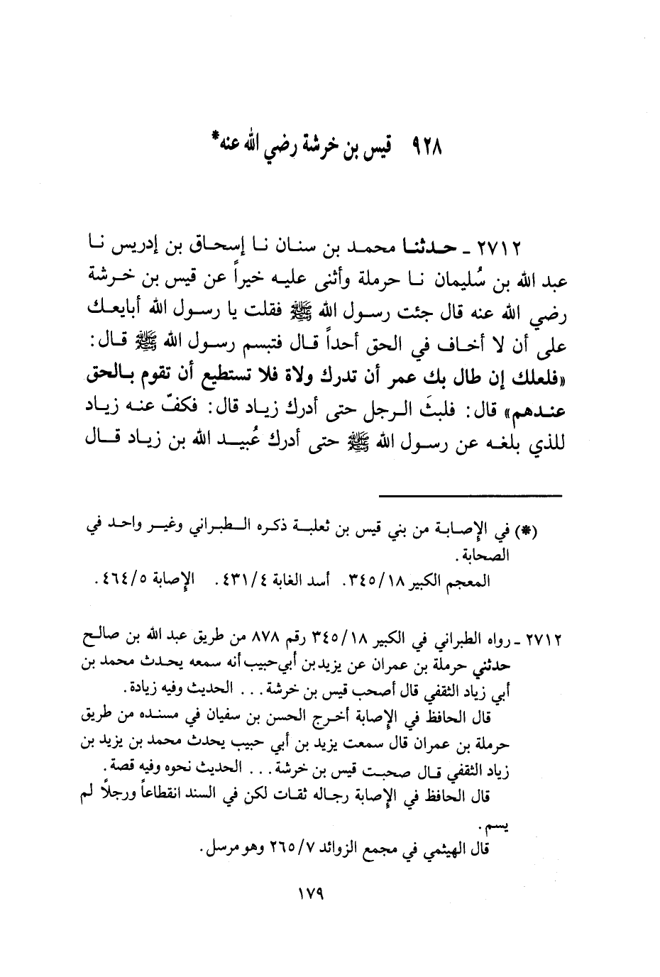 2712 - حَدَّثَنَا مُحَمَّدُ بْنُ سِنَانٍ، نا إِسْحَاقُ بْنُ إِدْرِيسَ، نا عَبْدُ اللَّهِ بْنُ سُلَيْمَانَ، نا حَرْمَلَةُ، وَأَثْنَى عَلَيْهِ خَيْرًا، عَنْ قَيْسِ بْنِ خَرَشَةَ رَضِيَ اللَّهُ عَنْهُ قَالَ: جِئْتُ رَسُولَ اللَّهِ صَلَّى اللهُ عَلَيْهِ وَسَلَّمَ فَقُلْتُ: يَا رَسُولَ اللَّهِ، أُبَايِعُكَ عَلَى أَنْ لَا أَخَافَ فِي الْحَقِّ أَحَدًا " قَالَ: فَتَبَسَّمَ رَسُولُ اللَّهِ صَلَّى اللهُ عَلَيْهِ وَسَلَّمَ قَالَ: «§فَلَعَلَّكَ إِنْ طَالَ بِكَ عُمْرٌ أَنْ تُدْرِكَ وُلَاةً فَلَا تَسْتَطِيعُ أَنْ تَقُومَ بِالْحَقِّ عِنْدَهُمْ» قَالَ: فَلَبِثَ الرَّجُلُ حَتَّى أَدْرَكَ زِيَادًا قَالَ: فَكَفَّ عَنْهُ زِيَادٌ لِلَّذِي بَلَغَهُ عَنْ رَسُولِ اللَّهِ صَلَّى اللهُ عَلَيْهِ وَسَلَّمَ، حَتَّى أَدْرَكَ عُبَيْدَ اللَّهِ بْنَ زِيَادٍ قَالَ -[180]-: فَأَرْسَلَ إِلَيْهِ عُبَيْدُ اللَّهِ بْنُ زِيَادٍ وَقَالَ: أَنْتَ الَّذِي تَكْذِبُ عَلَى اللَّهِ عَزَّ وَجَلَّ وَعَلَى رَسُولِهِ عَلَيْهِ السَّلَامُ؟ قَالَ: لَا، وَلَكِنْ إِنْ شِئْتَ أَخْبَرْتُكَ بِالَّذِي يَكْذِبُ عَلَى اللَّهِ عَزَّ وَجَلَّ وَعَلَى رَسُولِهِ عَلَيْهِ السَّلَامُ؟ قَالَ: فَقَالَ عَلَيَّ بِصَاحِبِ الْعَذَابِ. قَالَ: فَلَمَّا جَاءَ قَالَ: آتِنِي بِعَذَابِكَ. قَالَ: فَجَاءَ بِهَا يُعَذِّبُ بِهِ قَالَ: فَمَاتَ قَيْسٌ رَضِيَ اللَّهُ عَنْهُ مِنْ قَبْلَ الْمَسَاءِ مِنْ غَيْرِ أَنْ يُصِيبَهُ شَيْءٌ