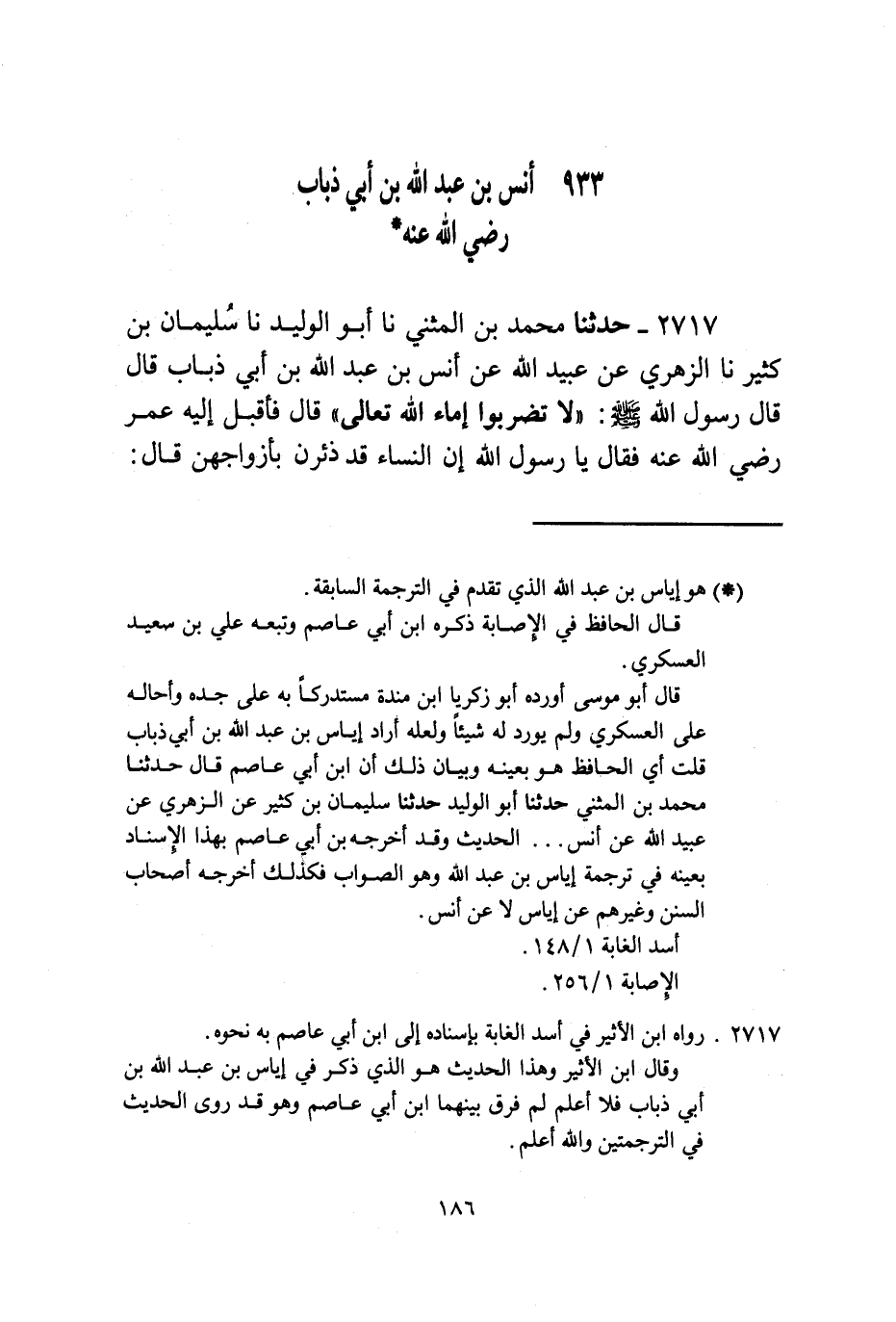 2717 - حَدَّثَنَا مُحَمَّدُ بْنُ الْمُثَنَّى، نا أَبُو الْوَلِيدِ، نا سُلَيْمَانُ بْنُ كَثِيرٍ، نا الزُّهْرِيُّ، عَنْ عُبَيْدِ اللَّهِ، عَنْ أَنَسِ بْنِ عَبْدِ اللَّهِ بْنِ أَبِي ذُبَابٍ قَالَ: قَالَ رَسُولُ اللَّهِ صَلَّى اللهُ عَلَيْهِ وَسَلَّمَ: «§لَا تَضْرِبُوا إِمَاءَ اللَّهِ تَعَالَى» قَالَ: فَأَقْبَلَ إِلَيْهِ عُمَرُ رَضِيَ اللَّهُ عَنْهُ فَقَالَ: يَا رَسُولَ اللَّهِ، إِنَّ النِّسَاءَ قَدْ ذَئِرْنَ بِأَزْوَاجِهِنَّ. قَالَ -[187]-: «فَاضْرِبُوهُنَّ» قَالَ: فَأَصْبَحَ عَلَى بَابِ رَسُولِ اللَّهِ صَلَّى اللهُ عَلَيْهِ وَسَلَّمَ مِنْهُنَّ سَبْعُونَ امْرَأَةً يَشْتَكِينَ أَزْوَاجَهُنَّ، فَقَالَ رَسُولُ اللَّهِ صَلَّى اللهُ عَلَيْهِ وَسَلَّمَ: «لَقَدْ بَاتَ يَطْرُقُ بِآلِ مُحَمَّدٍ سَبْعُونَ إِنْسَانًا، لَا تَحْسِبُونَ الَّذِينَ يَضْرِبُونَ خِيَارَكُمْ»