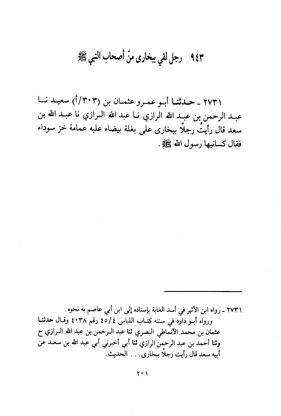 2731 - حَدَّثَنَا أَبُو عَمْرٍو عُثْمَانُ بْنُ سَعِيدٍ، نا عَبْدُ الرَّحْمَنِ بْنُ عَبْدِ اللَّهِ الرَّازِيُّ، نا عَبْدُ اللَّهِ الرَّازِيُّ، نا عَبْدُ اللَّهِ بْنُ سَعْدٍ قَالَ: §رَأَيْتُ رَجُلًا بِبُخَارَى عَلَى بَغْلَةٍ بَيْضَاءَ عَلَيْهِ عِمَامَةُ خَزٍّ سَوْدَاءُ فَقَالَ: كَسَانِيهَا رَسُولُ اللَّهِ صَلَّى اللهُ عَلَيْهِ وَسَلَّمَ