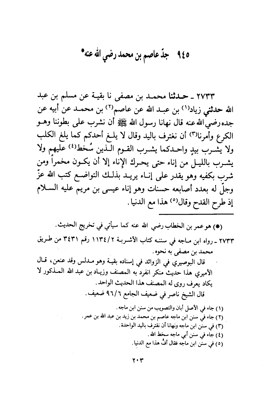 2733 - حَدَّثَنَا مُحَمَّدُ بْنُ مُصَفًّى، نا بَقِيَّةُ، عَنْ مُسْلِمِ بْنِ عَبْدِ اللَّهِ، حَدَّثَنِي زِيَادُ بْنُ عَبْدِ اللَّهِ، عَنْ عَاصِمِ بْنِ مُحَمَّدٍ، عَنْ أَبِيهِ، عَنْ جَدِّهِ رَضِيَ اللَّهُ عَنْهُ قَالَ: نَهَانَا رَسُولُ اللَّهِ صَلَّى اللهُ عَلَيْهِ وَسَلَّمَ أَنْ نَشْرَبَ عَلَى بُطُونِنَا وَهُوَ الْكَرْعُ وَأمَرَنَا أَنْ نَغْتَرِفَ بِالْيَدِ وَقَالَ: §لَا يَلَغْ أَحَدُكُمْ كَمَا يَلَغُ الْكَلْبُ وَلَا يَشْرَبْ بِيَدٍ وَاحِدٍ كَمَا يَشْرَبُ الْقَوْمُ الَّذِينَ سُخِطَ عَلَيْهِمْ وَلَا يَشْرَبْ بِاللَّيْلِ مِنْ إِنَاءٍ حَتَّى يُحَرِّكَ الْإِنَاءَ إِلَّا أَنَّ يَكُونَ مُخَمَّرًا وَمَنْ شَرِبَ بِكَفَّيْهِ وَهُوَ يُقْدَرُ عَلَى إِنَاءٍ يُرِيدُ بِذَلِكَ التَّوَاضُعَ كَتَبَ اللَّهُ عَزَّ وَجَلَّ لَهُ بِعَدَدِ أَصَابِعِهِ حَسَنَاتٍ، وَهُوَ إِنَاءُ عِيسَى ابْنِ مَرْيَمَ عَلَيْهِ السَّلَامُ إِذْ طَرَحَ الْقَدَحَ وَقَالَ: هَذَا مَعَ الدُّنْيَا "