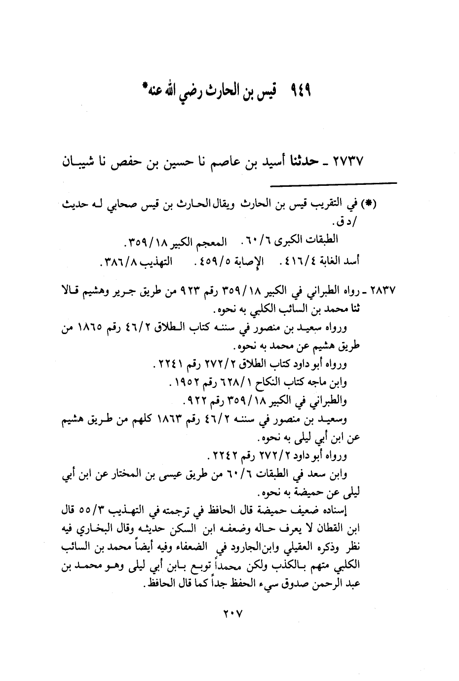 2737 - حَدَّثَنَا أُسَيْدُ بْنُ عَاصِمٍ، نا حُسَيْنُ بْنُ حَفْصٍ، نا شَيْبَانُ -[208]-، نا مُحَمَّدُ بْنُ السَّائِبِ، عَنْ حُمَيْضَةَ بِنْتِ الشَّمَرْدَلِ، عَنْ قَيْسِ بْنِ الْحَارِثِ بْنِ جِدَارٍ رَضِيَ اللَّهُ عَنْهُ أَنَّهُ قَالَ: أَسْلَمْتُ وَعِنْدِي ثَمَانِ نِسْوَةٍ فَأَتَيْتُ النَّبِيَّ صَلَّى اللهُ عَلَيْهِ وَسَلَّمَ فَقَالَ: «§اخْتَرْ مِنْهُنَّ أَرْبَعًا وَاتْرُكْ أَرْبَعًا»