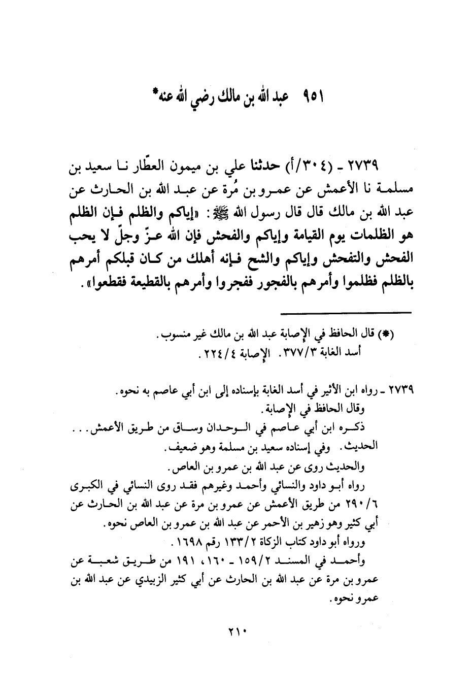 2739 - حَدَّثَنَا عَلِيُّ بْنُ مَيْمُونٍ الْعَطَّارُ، نا سَعِيدُ بْنُ مَسْلَمَةَ، نا الْأَعْمَشُ، عَنْ عَمْرِو بْنِ مُرَّةَ، عَنْ عَبْدِ اللَّهِ بْنِ الْحَارِثِ، عَنْ عَبْدِ اللَّهِ بْنِ مَالِكٍ قَالَ: قَالَ رَسُولُ اللَّهِ صَلَّى اللهُ عَلَيْهِ وَسَلَّمَ: «§إِيَّاكُمْ وَالظُّلْمَ، فَإِنَّ الظُّلْمَ هُوَ الظُّلُمَاتُ يَوْمَ الْقِيَامَةِ، وَإِيَّاكُمْ وَالْفُحْشَ، فَإِنَّ اللَّهَ عَزَّ وَجَلَّ لَا يُحِبُّ الْفُحْشَ وَالتَّفَحُّشَ، وَإِيَّاكُمْ وَالشُّحَّ فَإِنَّهُ أَهْلَكَ مَنْ كَانَ قِبْلَكُمْ أَمَرَهُمْ بِالظُّلْمِ فَظَلَمُوا وَأَمَرَهُمْ بِالْفُجُورِ فَفَجَرُوا وَأَمَرَهُمْ بِالْقَطِيعَةِ فَقَطَعُوا»