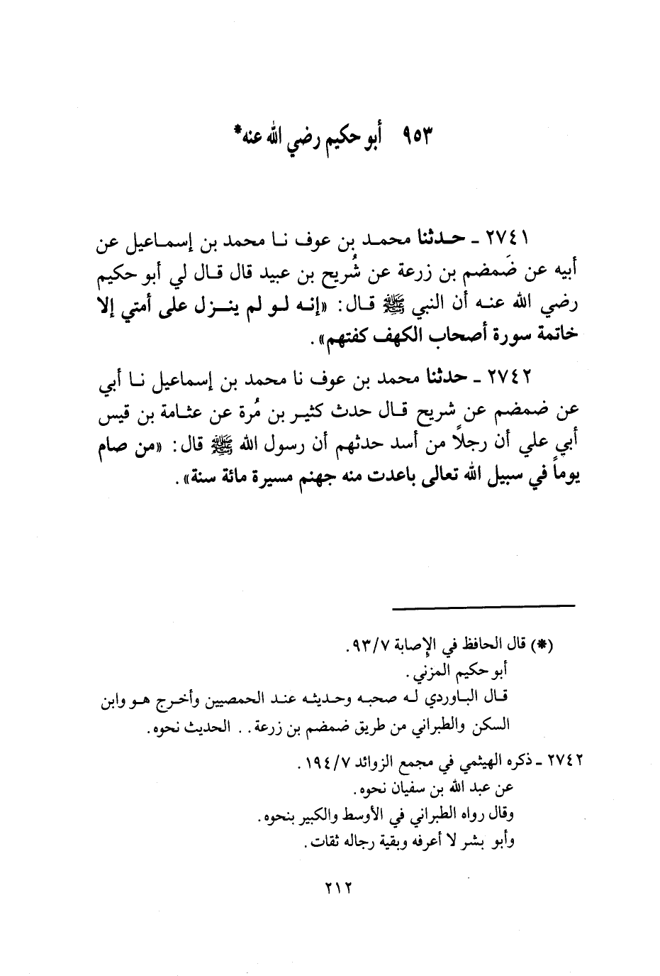 2741 - حَدَّثَنَا مُحَمَّدُ بْنُ عَوْفٍ، نا مُحَمَّدُ بْنُ إِسْمَاعِيلَ، عَنْ أَبِيهِ، عَنْ ضَمْضَمِ بْنِ زُرْعَةَ، عَنْ شُرَيْحِ بْنِ عُبَيْدٍ قَالَ: قَالَ لِي أَبُو حَكِيمٍ رَضِيَ اللَّهُ عَنْهُ: إِنَّ النَّبِيَّ صَلَّى اللهُ عَلَيْهِ وَسَلَّمَ قَالَ: «إِنَّهُ §لَوْ لَمْ يَنْزِلْ عَلَى أُمَّتِي إِلَّا خَاتِمَةُ سُورَةِ أَصْحَابِ الْكَهْفِ كَفَتْهُمْ»