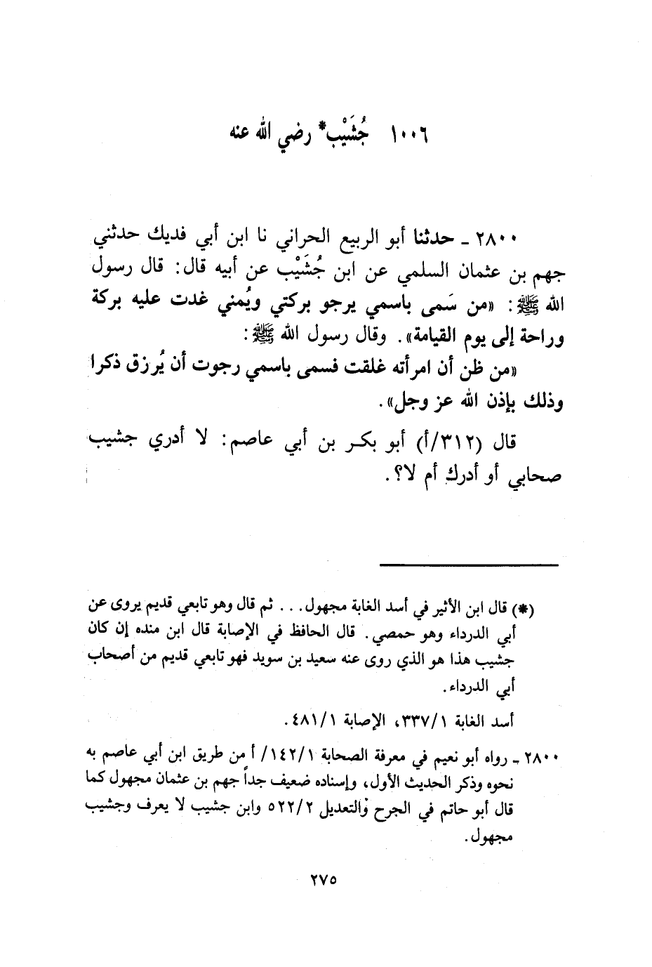 2800 - حَدَّثَنَا أَبُو الرَّبِيعِ الْحَرَّانِيُّ نا ابْنُ أَبِي فُدَيْكٍ، حَدَّثَنِي جَهْمُ بْنُ عُثْمَانَ السَّلَمِيُّ، عَنِ ابْنِ جَشِيبٍ، عَنْ أَبِيهِ قَالَ: قَالَ رَسُولُ اللَّهِ صَلَّى اللهُ عَلَيْهِ وَسَلَّمَ: «§مَنْ سَمَّى بِاسْمِي يَرْجُو بَرَكَتِي وَيُمْنِي غَدَتْ عَلَيْهِ بَرَكَةٌ وَرَاحَةٌ إِلَى يَوْمِ الْقِيَامَةِ» وَقَالَ رَسُولُ اللَّهِ صَلَّى اللهُ عَلَيْهِ وَسَلَّمَ: «مَنْ ظَنَّ أَنَّ امْرَأَتَهُ غَلَقَتْ فَسَمَّى بِاسْمِي رَجَوْتُ أَنْ يُرْزَقَ ذَكَرًا، وَذَلِكَ بِإِذْنِ اللَّهِ عَزَّ وَجَلَّ» قَالَ أَبُو بَكْرِ بْنُ أَبِي عَاصِمٍ: لَا أَدْرِي جَشِيبٌ صَحَابِيٌّ أَوْ أَدْرَكَ أَمْ لَا