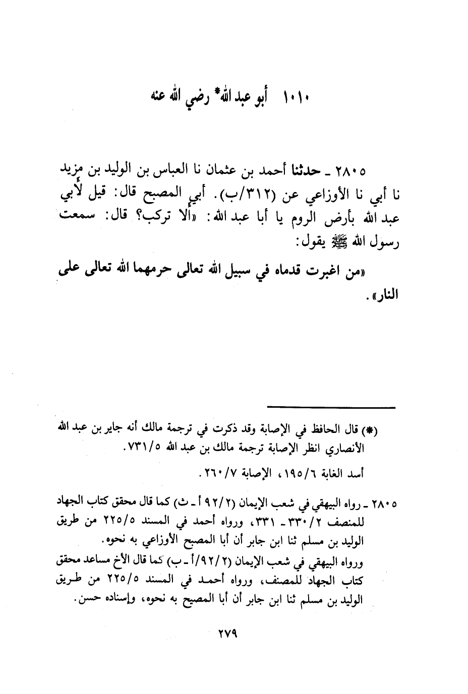 2805 - حَدَّثَنَا أَحْمَدُ بْنُ عُثْمَانَ، نا الْعَبَّاسُ بْنُ الْوَلِيدِ بْنِ مَزِيدٍ، نا أَبِي، نا الْأَوْزَاعِيُّ، عَنْ أَبِي الْمُصَبِّحِ قَالَ: قِيلَ لِأَبِي عَبْدِ اللَّهِ بِأَرْضِ الرُّومِ: يَا أَبَا عَبْدِ اللَّهِ أَلَا تَرْكَبُ؟ قَالَ: سَمِعْتُ رَسُولَ اللَّهِ صَلَّى اللهُ عَلَيْهِ وَسَلَّمَ يَقُولُ: «§مَنِ اغْبَرَّتْ قَدَمَاهُ فِي سَبِيلِ اللَّهِ تَعَالَى حَرَّمَهُمَا اللَّهُ تَعَالَى عَلَى النَّارِ»