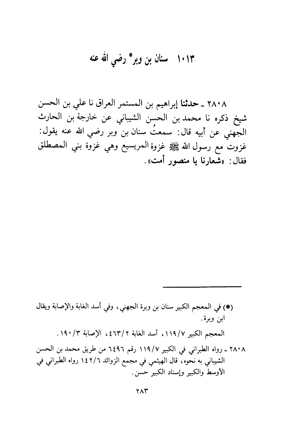 2808 - حَدَّثَنَا إِبْرَاهِيمُ بْنُ الْمُسْتَمِرِّ الْعَرَّاقُ، نا عَلِيُّ بْنُ الْحَسَنِ، شَيْخٌ ذَكَرَهُ، نا مُحَمَّدُ بْنُ الْحَسَنِ الشَّيْبَانِيُّ، عَنْ خَارِجَةَ بْنِ الْحَارِثِ الْجُهَنِيِّ، عَنْ أَبِيهِ قَالَ: سَمِعْتُ سِنَانَ بْنَ وَبَرٍ، رَضِيَ اللَّهُ عَنْهُ يَقُولُ: غَزَوْتُ مَعَ رَسُولِ اللَّهِ صَلَّى اللهُ عَلَيْهِ وَسَلَّمَ غَزْوَةَ الْمُرَيْسِيعِ وَهِيَ غَزْوَةُ بَنِي الْمُصْطَلِقِ فَقَالَ: " §شِعَارُنَا: يَا مَنْصُورُ أَمِتْ "