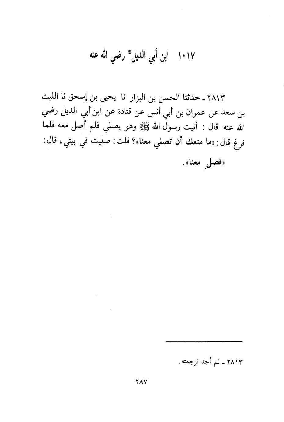 2813 - حَدَّثَنَا الْحَسَنُ بْنُ الْبَزَّارُ، نا يَحْيَى بْنُ إِسْحَاقَ، نا اللَّيْثُ بْنُ سَعْدٍ، عَنْ عِمْرَانَ بْنِ أَبِي أَنَسٍ، عَنْ قَتَادَةَ، عَنِ ابْنِ أَبِي الدِّيلِ، رَضِيَ اللَّهُ عَنْهُ قَالَ: أَتَيْتُ رَسُولَ اللَّهِ صَلَّى اللهُ عَلَيْهِ وَسَلَّمَ وَهُوَ يُصَلِّي فَلَمْ أُصَلِّ مَعَهُ فَلَمَّا فَرَغَ قَالَ: «§مَا مَنَعَكَ أَنْ تُصَلِّيَ مَعَنَا؟» قُلْتُ: صَلَّيْتُ فِي بَيْتِي. قَالَ: «فَصَلِّ مَعَنَا»