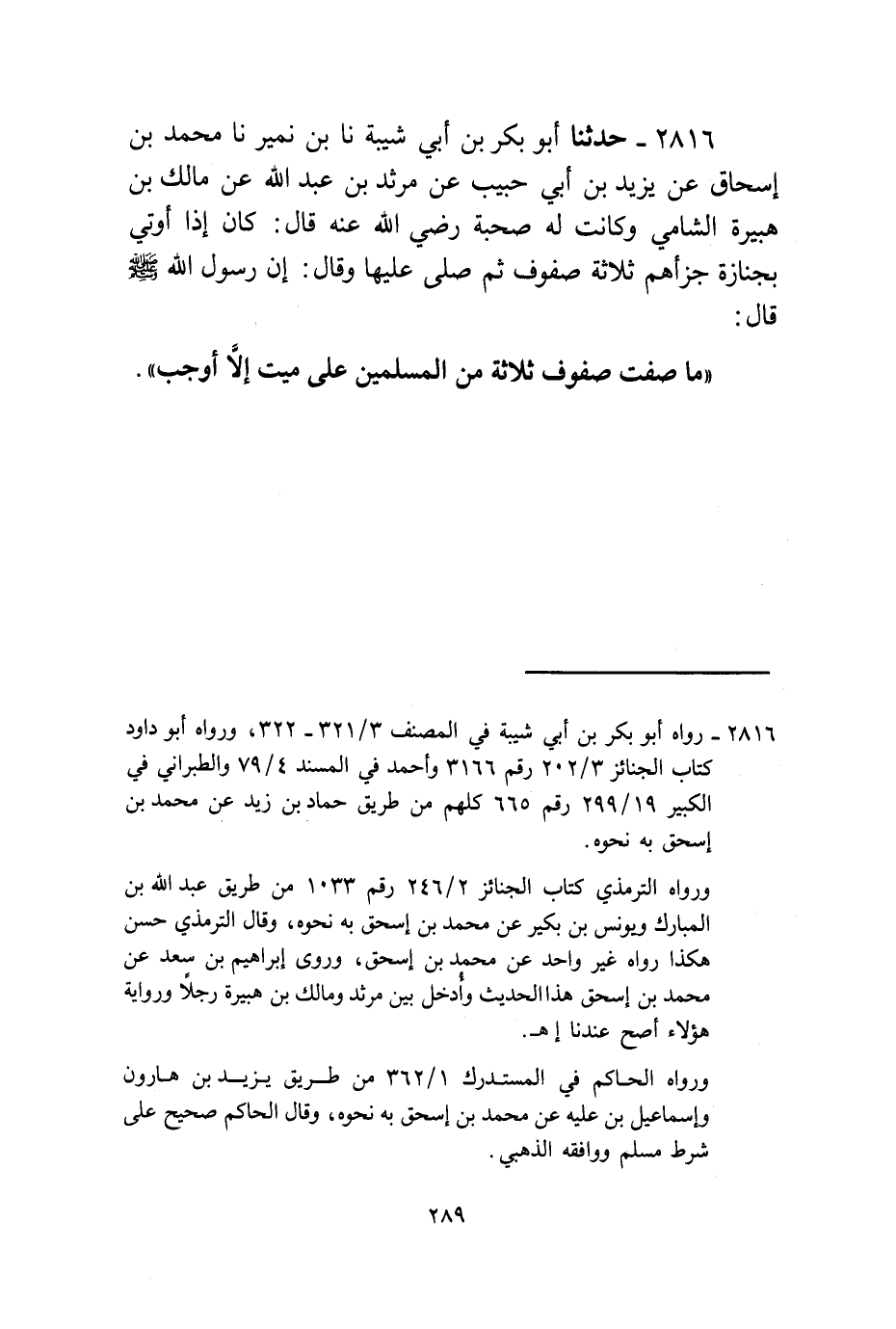 2816 - حَدَّثَنَا أَبُو بَكْرِ بْنُ أَبِي شَيْبَةَ، نا ابْنُ نُمَيْرٍ، نا مُحَمَّدُ بْنُ إِسْحَاقَ، عَنْ يَزِيدَ بْنِ أَبِي حَبِيبٍ، عَنْ مَرْثَدِ بْنِ عَبْدِ اللَّهِ، عَنْ مَالِكِ بْنِ هُبَيْرَةَ الشَّامِيِّ، وَكَانَتْ لَهُ صُحْبَةٌ رَضِيَ اللَّهُ عَنْهُ قَالَ: كَانَ إِذَا أُوتِي بِجَنَازَةٍ جَزَّأَهُمْ ثَلَاثَةَ صُفُوفٍ ثُمَّ صَلَّى عَلَيْهَا وَقَالَ: إِنَّ رَسُولَ اللَّهِ صَلَّى اللهُ عَلَيْهِ وَسَلَّمَ قَالَ: «§مَا صُفَّتْ صُفُوفٌ ثَلَاثَةٌ مِنَ الْمُسْلِمِينَ عَلَى مَيِّتٍ إِلَّا أَوْجَبَ»