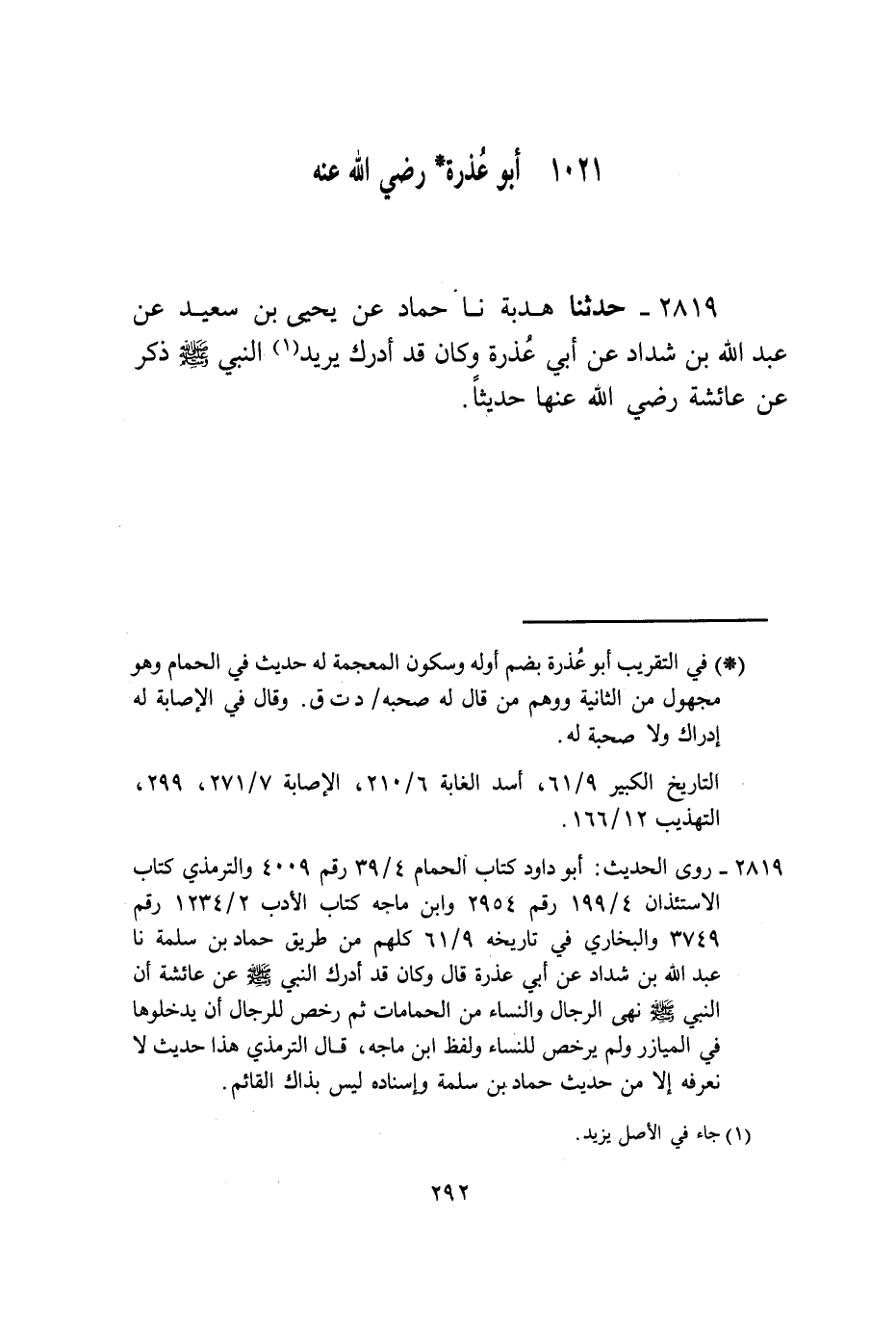 2819 - حَدَّثَنَا هُدْبَةُ، نَا حَمَّادٌ، عَنْ يَحْيَى بْنِ سَعِيدٍ، عَنْ عَبْدِ اللَّهِ بْنِ شَدَّادٍ، عَنْ أَبِي عُذْرَةَ، وَكَانَ، قَدْ أَدْرَكَ يُرِيدُ النَّبِيَّ صَلَّى اللهُ عَلَيْهِ وَسَلَّمَ، ذَكَرَ عَنْ عَائِشَةَ رَضِيَ اللَّهُ عَنْهُا حَدِيثًا