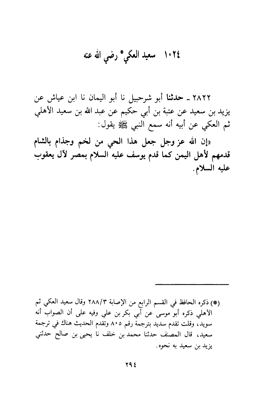 2822 - حَدَّثَنَا أَبُو شُرَحْبِيلَ، نا أَبُو الْيَمَانِ، نا ابْنُ عَيَّاشٍ، عَنْ يَزِيدَ بْنِ سَعِيدٍ، عَنْ عُتْبَةَ بْنِ أَبِي حَكِيمٍ، عَنْ عَبْدِ اللَّهِ بْنِ سُوَيْدٍ الْأُلْهَانِيِّ ثُمَّ الْعَكِّيِّ، عَنْ أَبِيهِ، أَنَّهُ سَمِعَ النَّبِيَّ صَلَّى اللهُ عَلَيْهِ وَسَلَّمَ يَقُولُ: «إِنَّ §اللَّهَ عَزَّ وَجَلَّ جَعَلَ هَذَا الْحَيَّ مِنْ لَخْمٍ وَجُذَامَ بِالشَّامِ قَدَّمَهُمْ لِأَهْلِ الْيَمَنِ كَمَا قَدِمَ يُوسُفُ عَلَيْهِ السَّلَامُ بِمِصْرَ لِآلِ يَعْقُوبَ عَلَيْهِ السَّلَامُ»